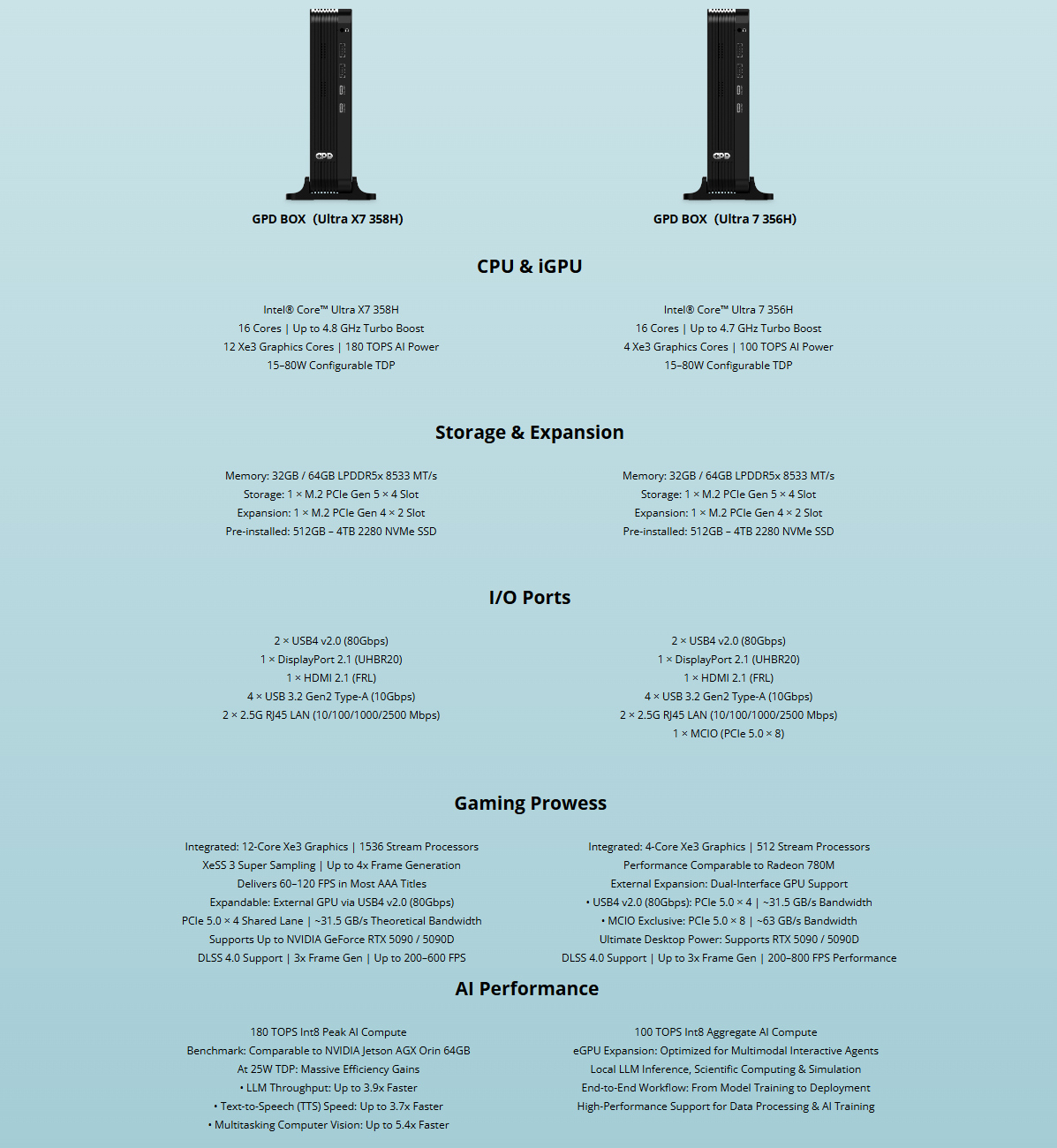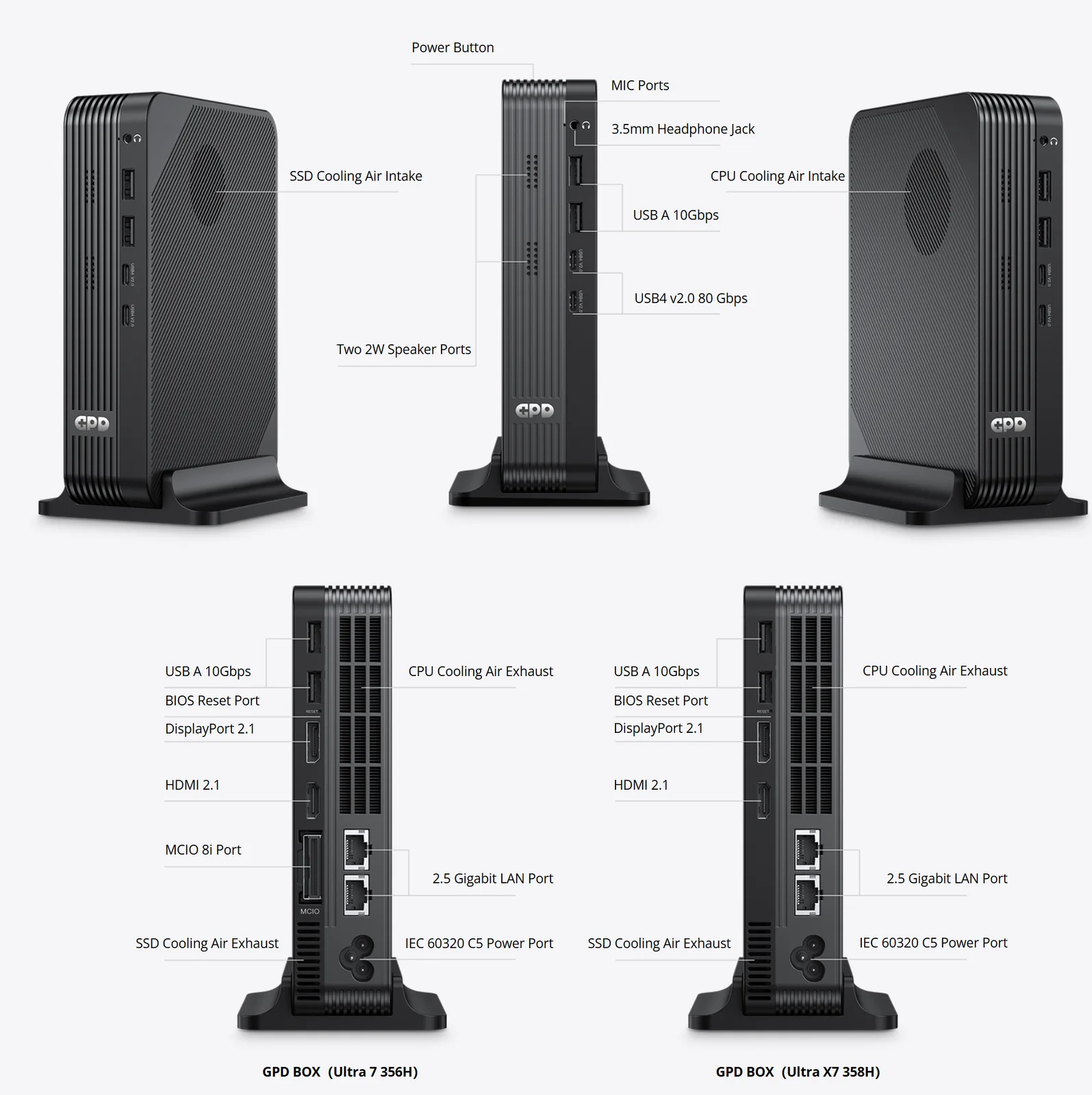 Ora, l'azienda ha condiviso altre specifiche del GPD Box. Come conferma l'azienda, il mini PC sarà alimentato dalle CPU Intel Panther Lake. In particolare, ci saranno due opzioni disponibili: una con l' Intel Core Ultra X7 358H e l'altra con il Core Ultra 7 356H.