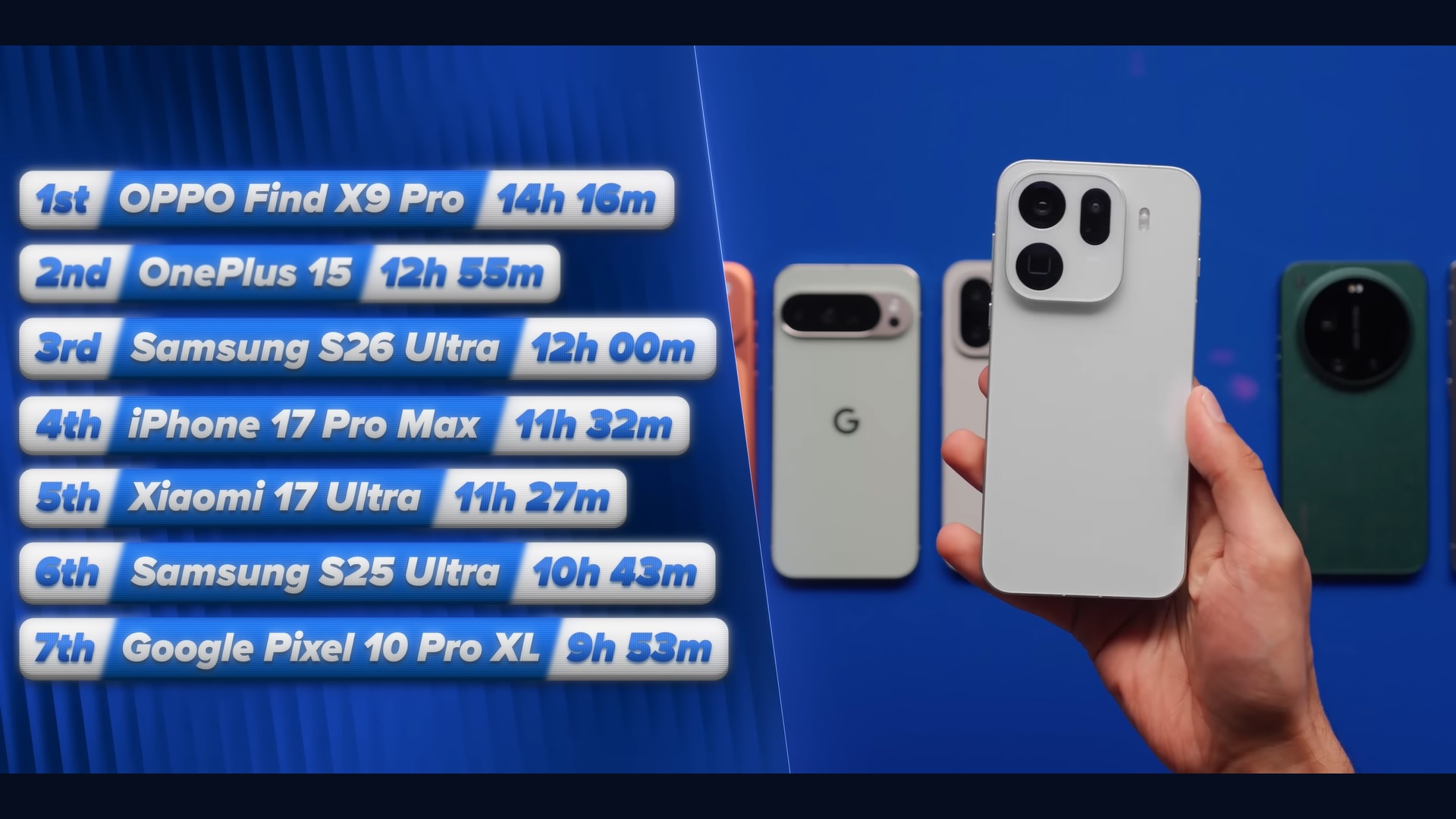 L' iPhone 17 Pro Max ha preceduto il Galaxy S26 Ultra di 28 minuti. Lo Xiaomi 17 Ultra si è battuto in modo deludente con 11 ore e 27 minuti, nonostante la batteria da 6.000 mAh. Il Galaxy S25 Ultra e il Pixel 10 Pro XL si posizionano in fondo alla scala, registrando rispettivamente solo 10 ore e 43 minuti e 9 ore e 53 minuti.