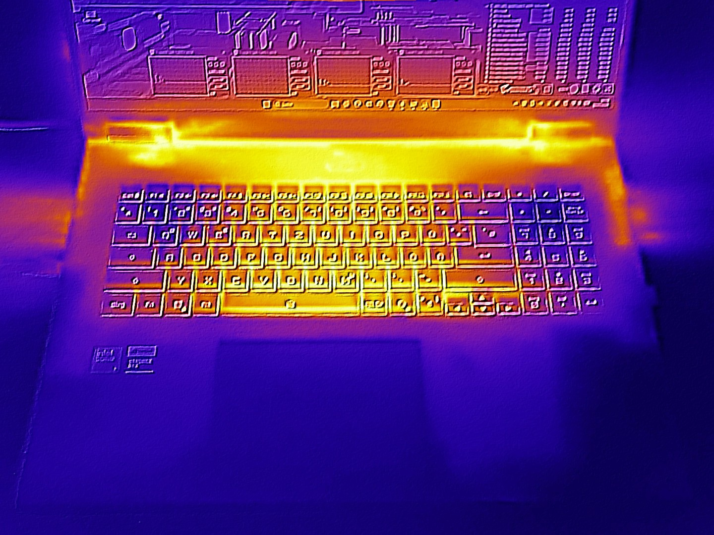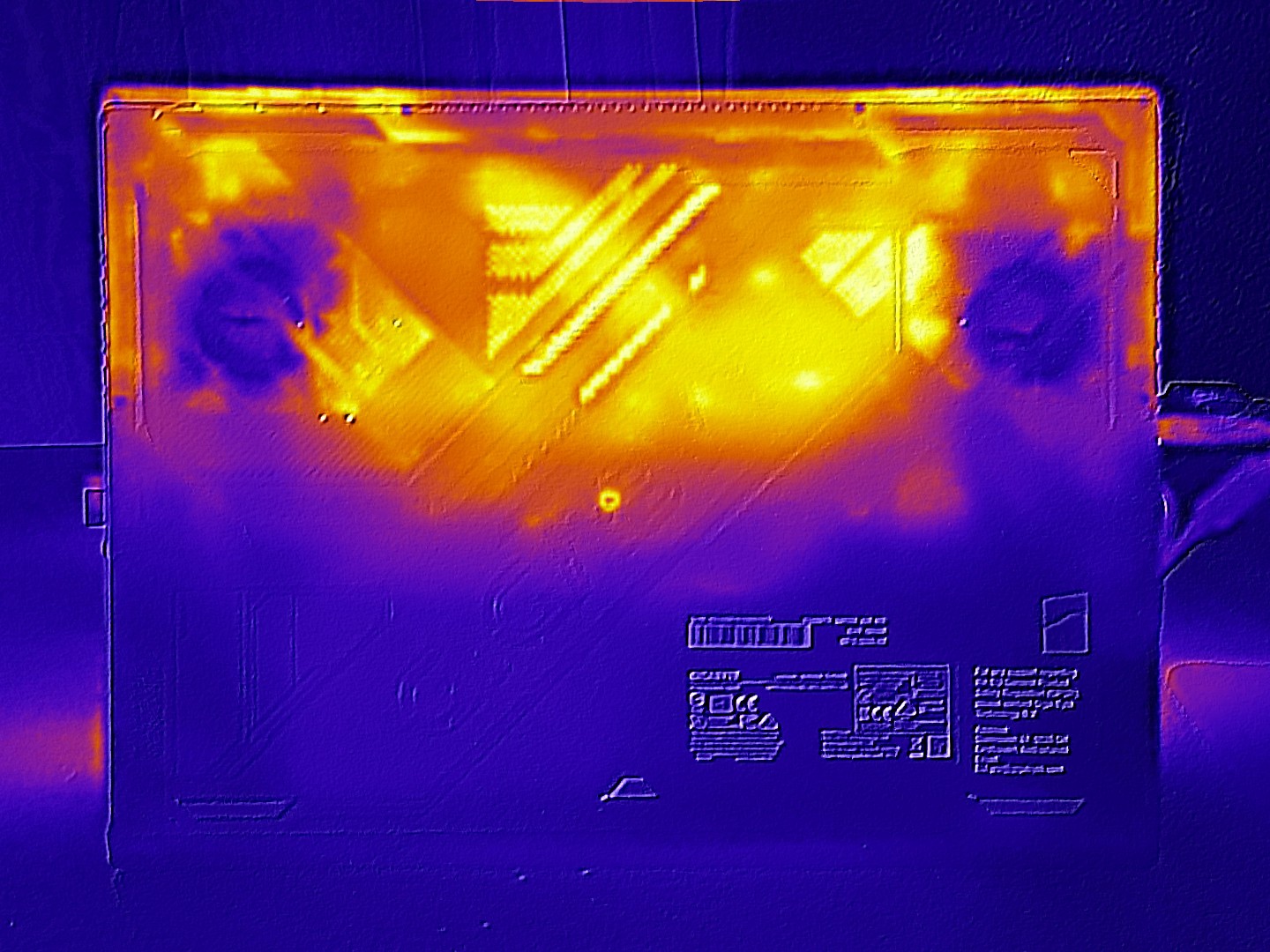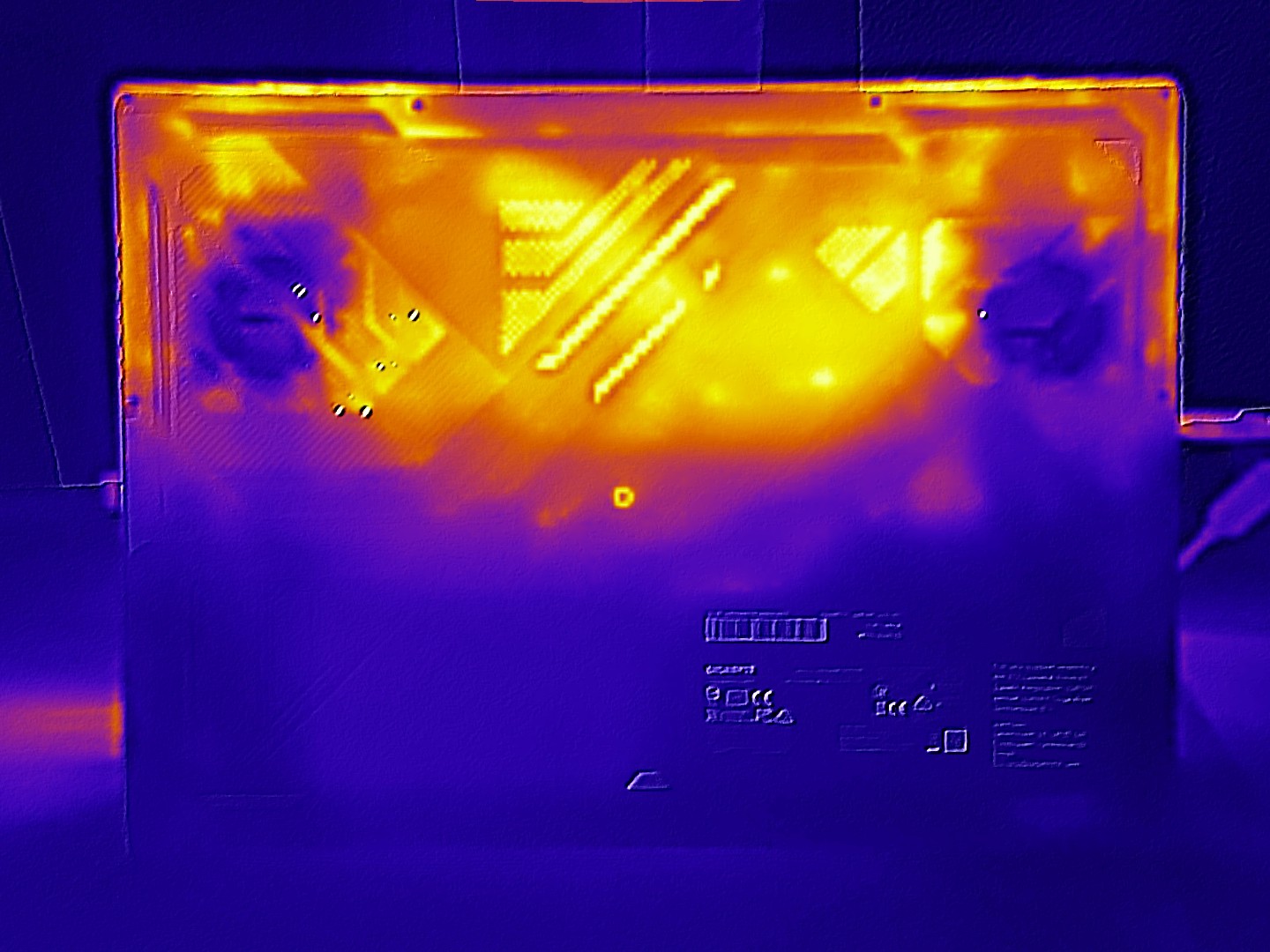 Le temperature rientrano nell'intervallo previsto. Un massimo di circa 118°F nella parte superiore e ~120°F nella parte inferiore dello chassis sono tipici per un dispositivo di questa classe di prestazioni. Al minimo, la maggior parte dello chassis rimane al di sotto di circa 86°F, quindi è ancora molto confortevole.