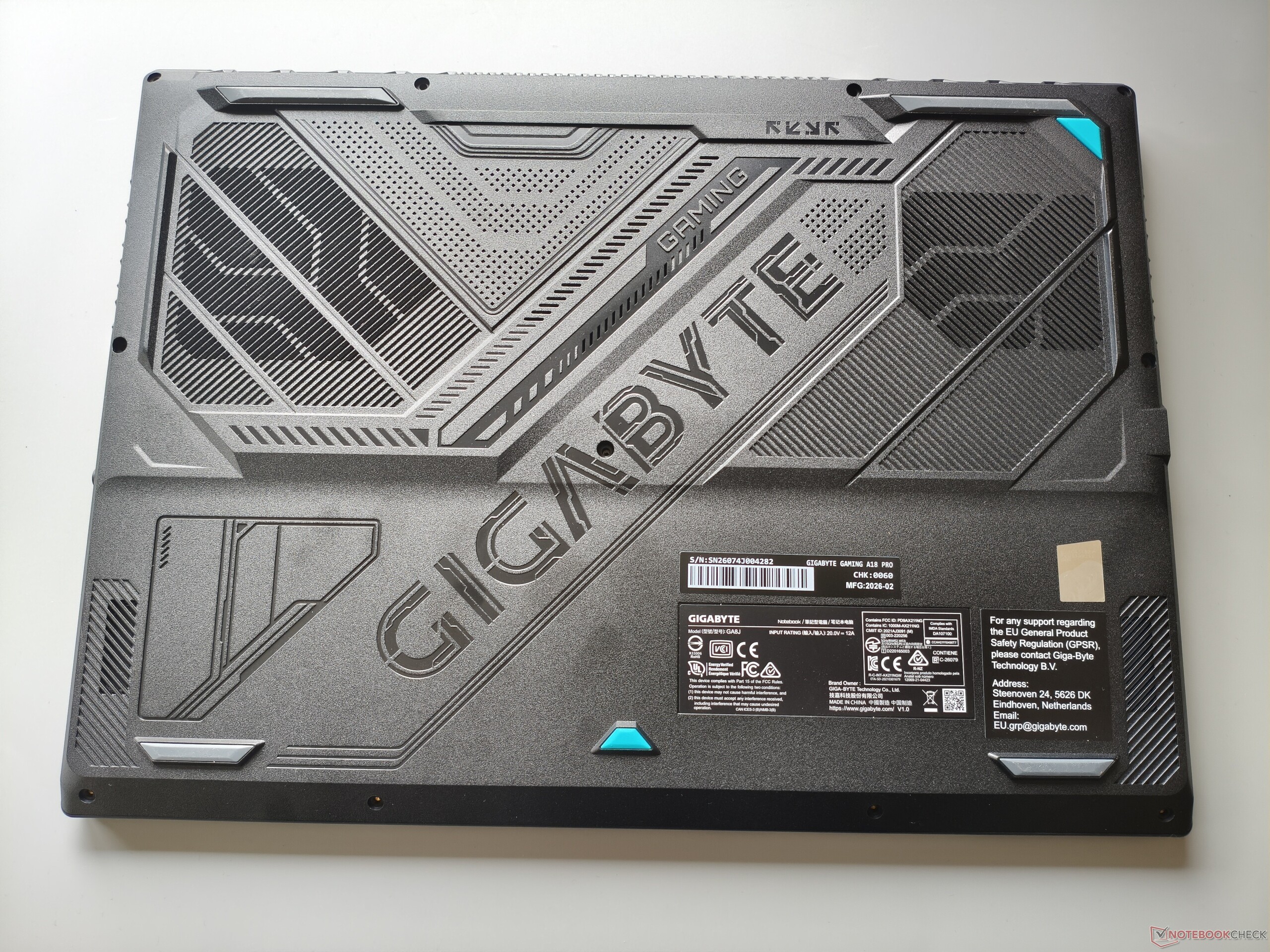 Gigabyte ha optato per un design piuttosto pulito con Gaming A18 Pro, che, a parte il design audace della parte inferiore dello chassis, evita qualsiasi sperimentazione importante. Le superfici grigio scuro sono solide e stabili nella maggior parte delle aree, e le cerniere - che consentono al display di aprirsi fino a 180° - svolgono la loro funzione in modo discreto per la maggior parte del tempo. Lo stesso vale per la qualità costruttiva, che lascia poco a desiderare.