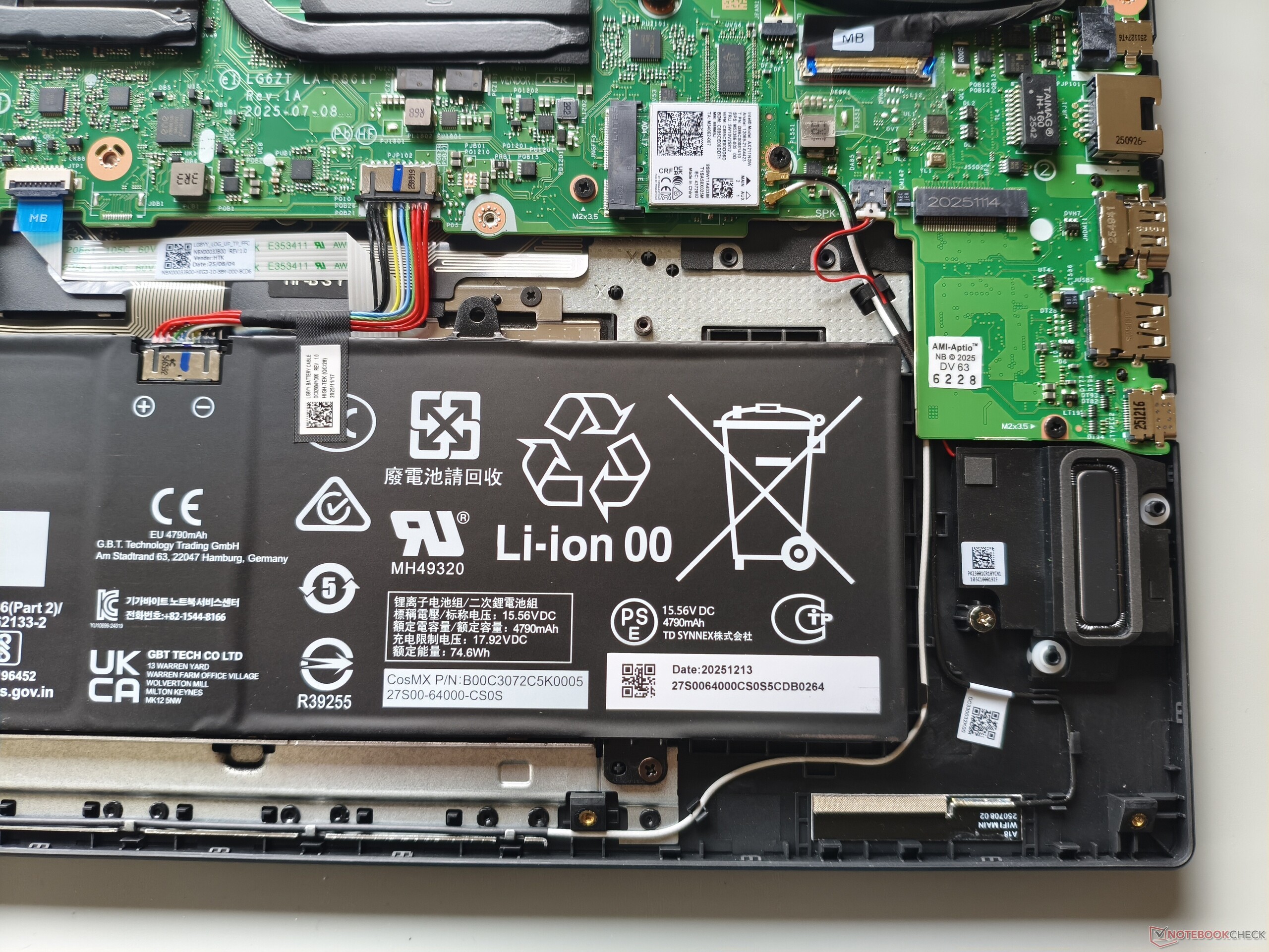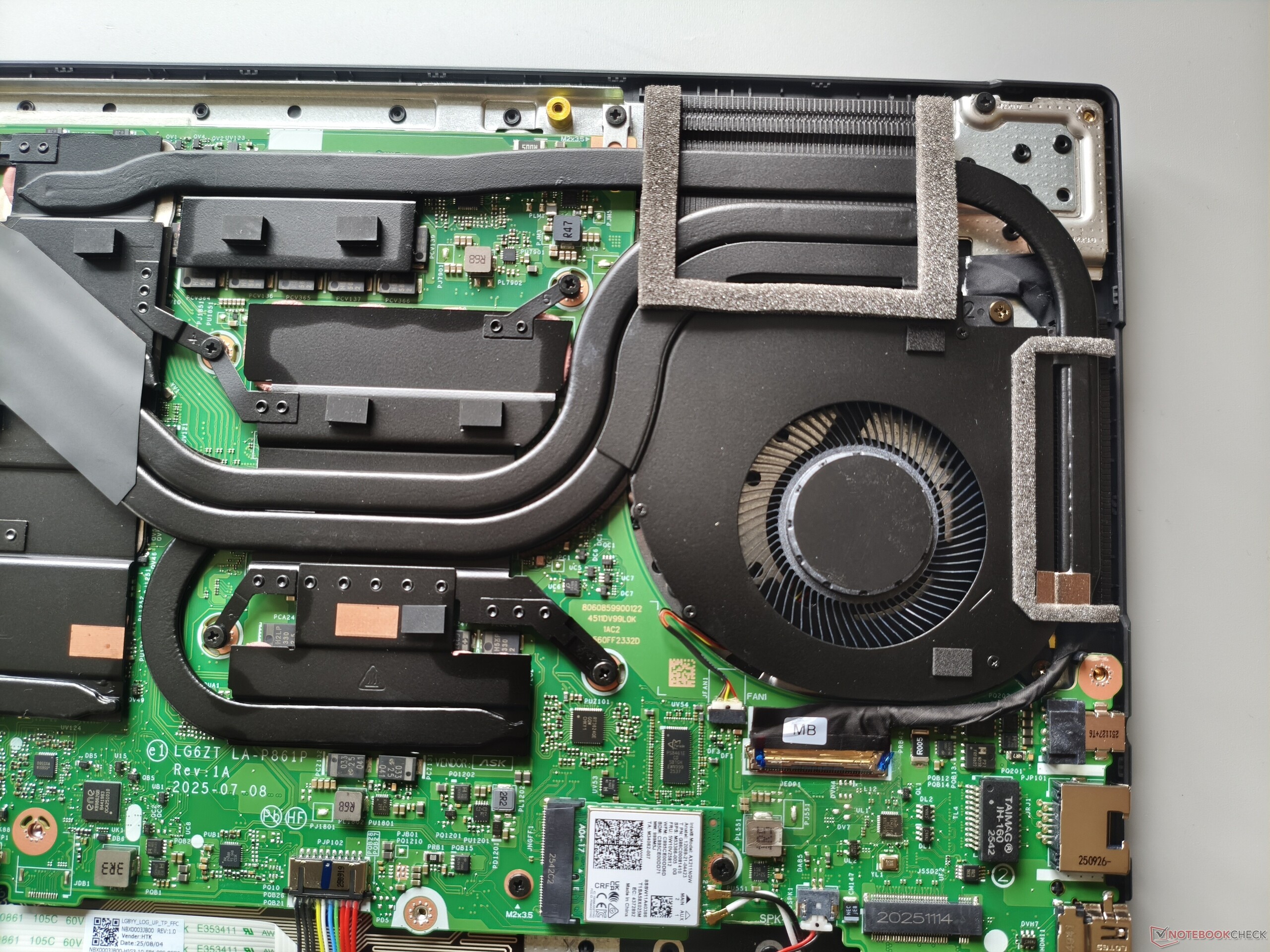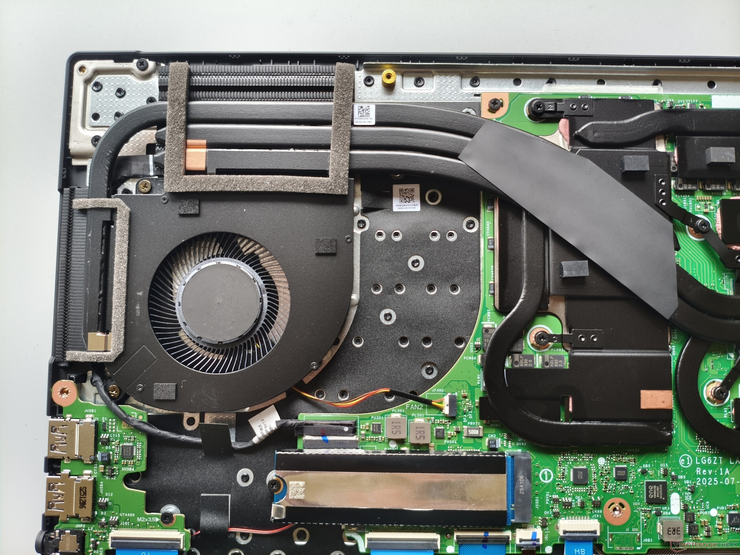 Il pannello inferiore può essere rimosso dopo aver allentato 11 viti Phillips. Sotto, diventa chiaro che ci sarebbe stato spazio per una batteria più grande. Due slot M.2 per SSD (uno dei quali è ancora libero) sono abbastanza decenti, ma la RAM saldata e la mancanza di slot SO-DIMM sono uno svantaggio dal punto di vista dell'aggiornamento.