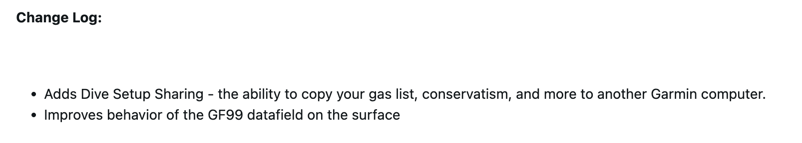 In un post sul forum Garmin, un rappresentante del marchio ha confermato che il nuovo aggiornamento della versione 25.21 aggiunge una nuova funzione a Descent G2. Si chiama Dive Setup Sharing e consente agli utenti di copiare rapidamente informazioni chiave come la lista dei gas e la conservatività tra due computer Garmin. I dispositivi devono trovarsi a una distanza di 3 m (~10 ft) l'uno dall'altro durante il trasferimento, con lo strumento che si trova alla voce Dive Setup > Setup Sharing (Garmin how-to page).