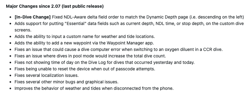 Le note di rilascio del software di sistema Garmin Descent X30 3.06 affermano che consente agli utenti di aggiungere campi dati essenziali, come la profondità corrente, il tempo NDL e la profondità di arresto, alla schermata di immersione personalizzata. Ci sono due cambiamenti relativi alle informazioni sul tempo e sulle maree. Innanzitutto, ora è possibile aggiungere un nome personalizzato per queste località. In secondo luogo, si dice che sia stato migliorato il comportamento di queste funzioni quando l'indossabile non è collegato al telefono.
