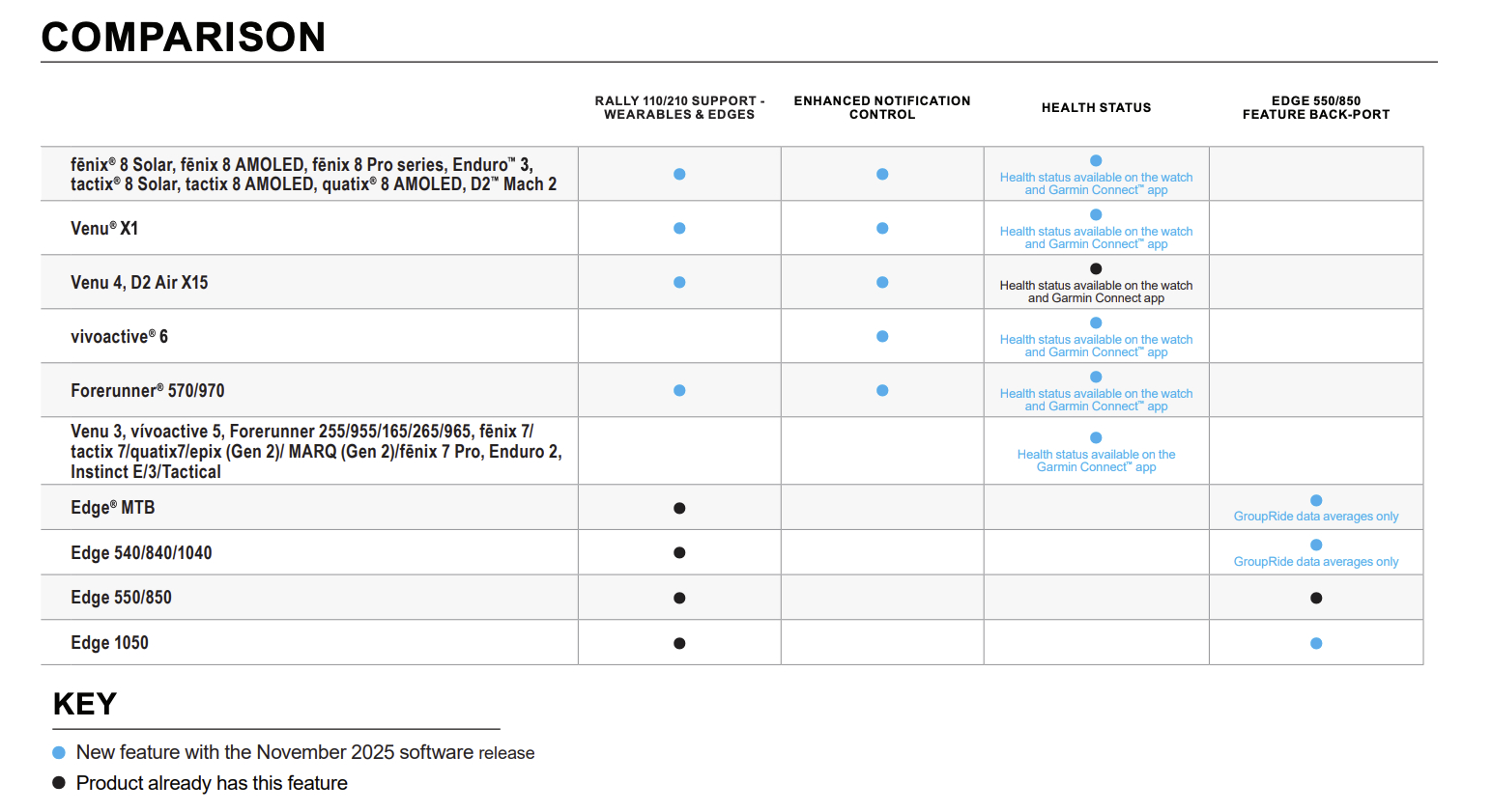 Per quanto riguarda il resto dell'ultimo Feature Update di Garmin, molti sono consegnati alla serie di cycling computer, come lo Smart Fueling e l'analisi del rapporto di trasmissione. Detto questo, Garmin offre anche un migliore controllo delle notifiche su Fenix 8, Forerunner 970, Venu 4 e Venu X1, tra gli altri smartwatch associati. Inoltre, Garmin ha aggiunto il supporto per Rally 110 e Rally 210 per numerosi indossabili, con l'aggiornamento delle funzioni di novembre 2025, come mostra l'immagine qui sopra.