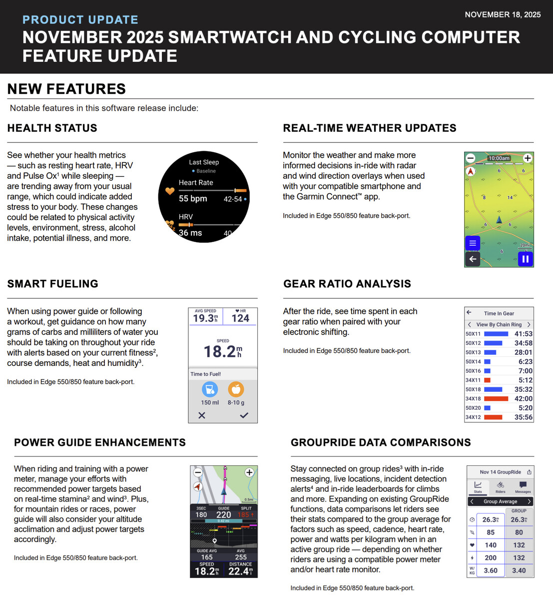 Garmin afferma che l'aggiornamento delle funzioni di novembre 2025 verrà rilasciato gradualmente. Pertanto, potrebbero essere necessarie ancora alcune settimane prima che gli aggiornamenti software corrispondenti arrivino sui cycling computer e sugli smartwatch idonei. Purtroppo, Garmin non ha ancora confermato i numeri di build dei relativi aggiornamenti software.