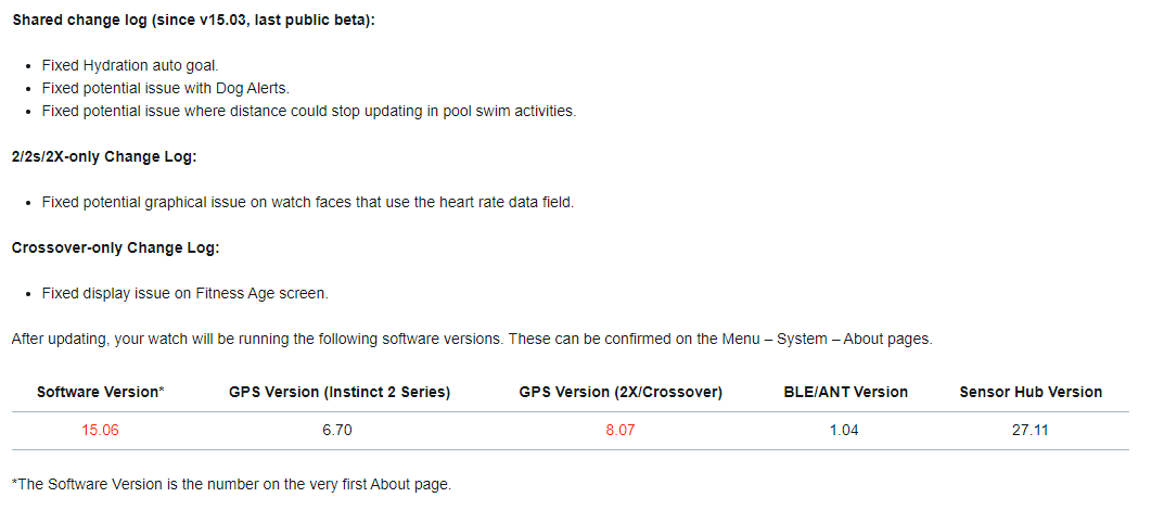 Nel registro delle modifiche per tutti gli indossabili Instinct 2 è elencata una soluzione per un problema con l'obiettivo automatico Idratazione. Inoltre, sono state applicate a tutti gli smartwatch le correzioni per un potenziale problema con gli avvisi per cani e un bug che potrebbe portare all'aggiornamento non corretto delle metriche della distanza durante le attività in piscina. Per gli orologi Instinct 2, Instinct 2s e Instinct 2X, Garmin ha risolto un problema grafico relativo al campo dati della frequenza cardiaca, un problema notato su diversi quadranti dell'orologio. Solo per l'Instinct Crossover è stato risolto un bug relativo al contenuto visualizzato nella schermata Fitness Age.