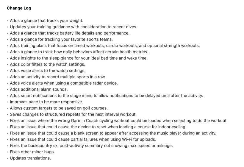 Garmin ha recentemente annunciato la versione beta 16.28 per questi smartwatch Forerunner in un post sul suo forum ufficiale. Mentre le note di rilascio (sotto) elencano oltre 20 cambiamenti, molti di questi sono arrivati con gli aggiornamenti precedenti nel ciclo di test 16.xx. Tuttavia, ci sono cinque nuovi miglioramenti con questa release.