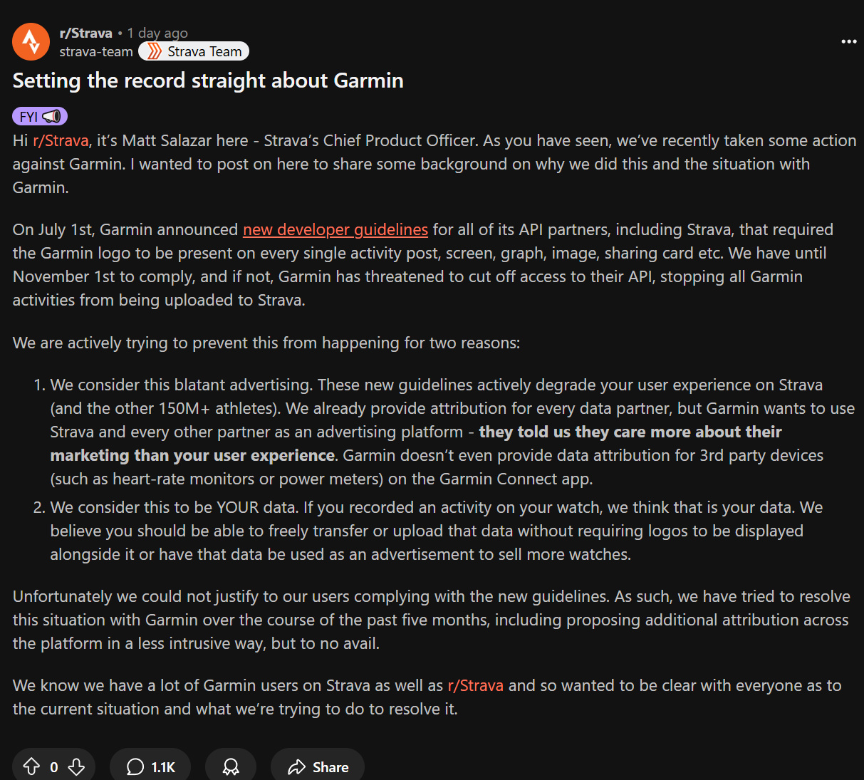 Nel frattempo, Strava ritiene che Garmin stia abusando dei brevetti 9297651 e 9778053, che secondo Strava si riferiscono alla 'generazione di mappe di attività preferite dall'utente'. In questa fase, non è chiaro quale sarà l'effetto, se ci sarà, di questo contenzioso sulle linee software e hardware di Garmin. Detto questo, un recente post su Reddit del Chief Product Officer di Strava indica che i problemi dell'azienda con Garmin non sono solo di natura brevettuale. Screenshottato se rimosso in futuro, per maggiori dettagli consulti la spiegazione di DC Rainmaker qui sotto.