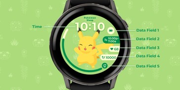 Oltre alla data e all'ora, il quadrante dell'orologio offre anche spazio per tre complicazioni rotonde che possono essere selezionate liberamente per visualizzare, ad esempio, i passi fatti, la frequenza cardiaca o i dettagli del monitoraggio del sonno direttamente sul quadrante dell'orologio. Il secondo quadrante dell'orologio, chiamato Pokémon Sleep: Scelgo te, consente agli utenti di scegliere tra un totale di 48 Pokémon diversi. Anche questo quadrante adatta la posa del Pokémon alla batteria del corpo, ma il quadrante offre spazio per cinque complicazioni.