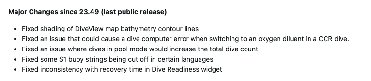 Ora, con il software di sistema 25.14, Garmin affronta altri bug riscontrati dagli utenti di Descent Mk3 e Descent Mk3i(attualmente 1.399,99 dollari su Amazon). Innanzitutto, l'azienda ha risolto un problema con l'ombreggiatura delle linee di contorno della batimetria sulla mappa DiveView. C'è una correzione per un errore del computer subacqueo, che si verificava quando gli utenti passavano a un diluente di ossigeno in un'immersione CCR.
