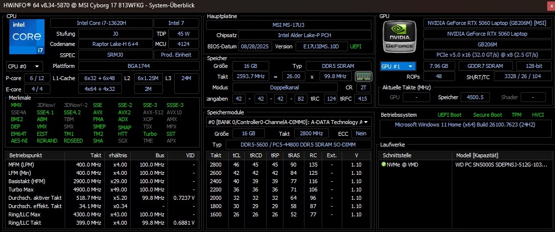 | MSI Cyborg 17 B13WFKG i7-13620H, GeForce RTX 5060 Laptop | Acer Nitro V 16 AI ANV16-42-R860 R5 240, GeForce RTX 5050 Laptop | HP Omen 16-ap0091ng R9 8940HX, GeForce RTX 5060 Laptop | Lenovo Legion 7 16IAX10 Ultra 7 255HX, GeForce RTX 5060 Laptop | Gigabyte Gaming A16 GA6H i7-13620H, GeForce RTX 5070 Laptop | |