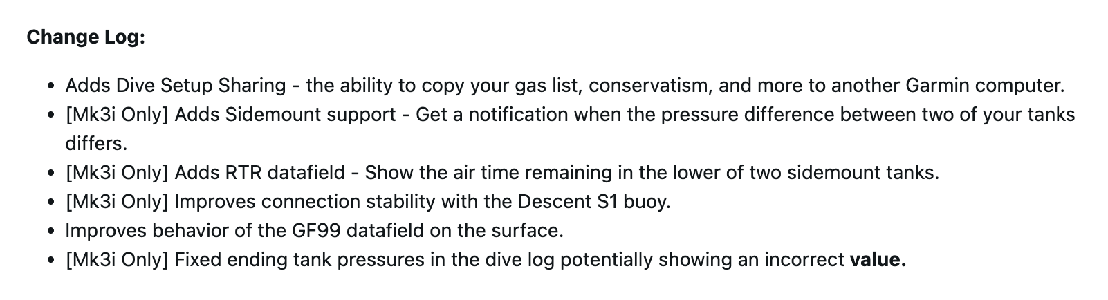 Con la versione 25.21, gli smartwatch Garmin Descent Mk3 e Mk3i ottengono una nuova funzione di condivisione delle impostazioni di immersione. Ciò consente agli utenti di copiare informazioni come l'elenco dei gas e la conservatività su un altro dispositivo Garmin. Entrambi i gadget vedono anche un miglioramento dei dati del Fattore di Gradiente 99% (GF99) mostrati in superficie.