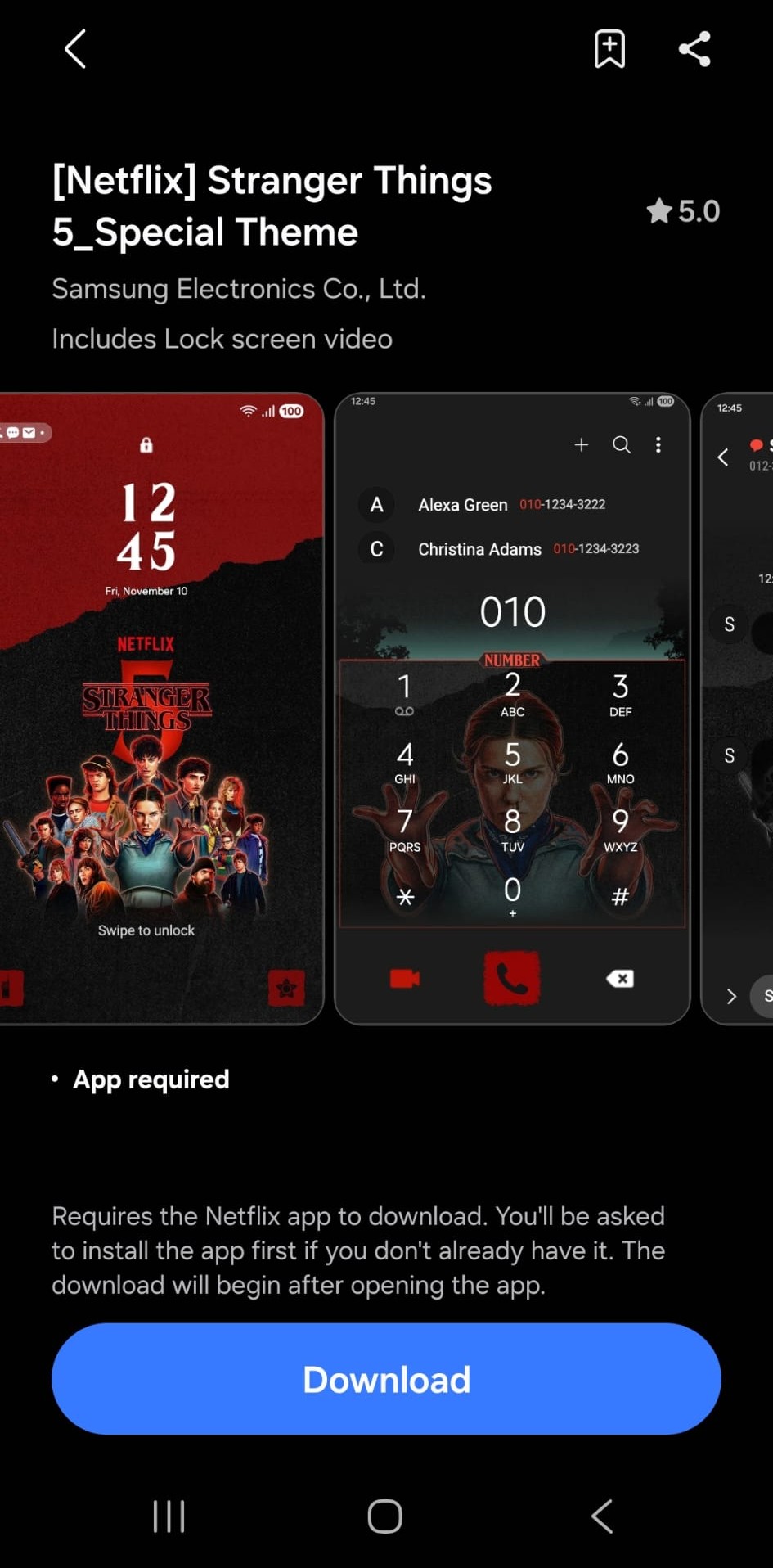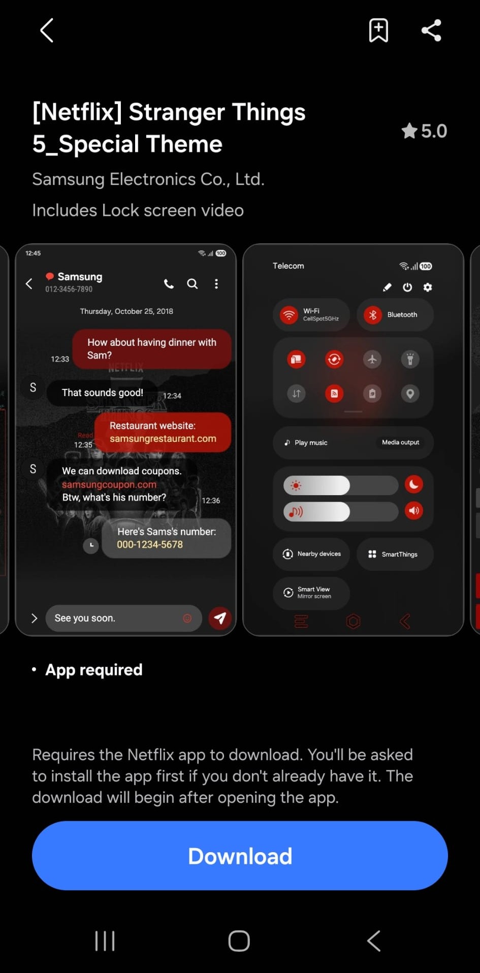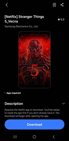 Il tema Stranger Things si basa sulla quinta e ultima stagione della serie, recentemente pubblicata. Include anche cinque sfondi, che possono essere scaricati gratuitamente dallo Store Galaxy, anche se per un periodo limitato.