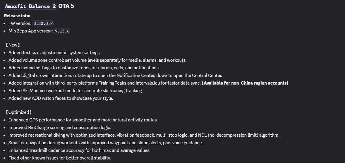 La release porta anche una serie di ottimizzazioni per lo smartwatch Amazfit Balance 2(attualmente 299,99 dollari su Amazon). Secondo il registro delle modifiche, le prestazioni del GPS sono ora più fluide e i percorsi suggeriti sono "più naturali". Inoltre, la navigazione durante l'allenamento ha migliorato la guida del percorso, i waypoint e gli avvisi di pendenza. La metrica del livello energetico BioCharge è stata migliorata, così come l'interfaccia per l'attività subacquea ricreativa. Può trovare il registro completo delle modifiche qui sotto.