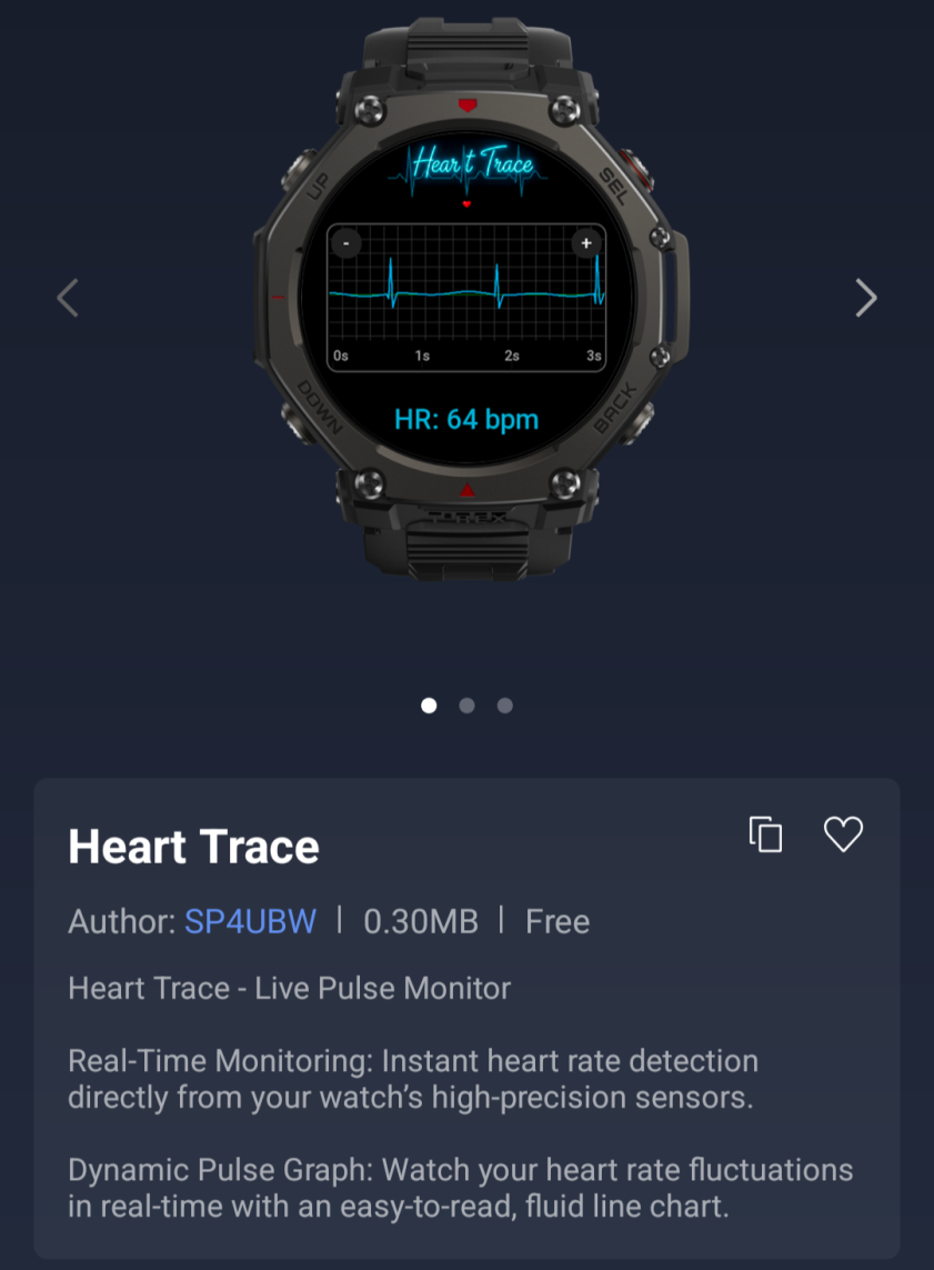 La più popolare delle tre Mini App è Heart Trace, attualmente in seconda posizione nella classifica Zepp OS Weekly Top 50 Apps Downloaded Chart. Si tratta di un monitor del polso dal vivo, che consente agli utenti di visualizzare i dati della frequenza cardiaca raccolti dal proprio smartwatch in tempo reale. Le misurazioni vengono visualizzate su un grafico dinamico del polso, descritto dallo sviluppatore come "un grafico a linee fluido e di facile lettura".