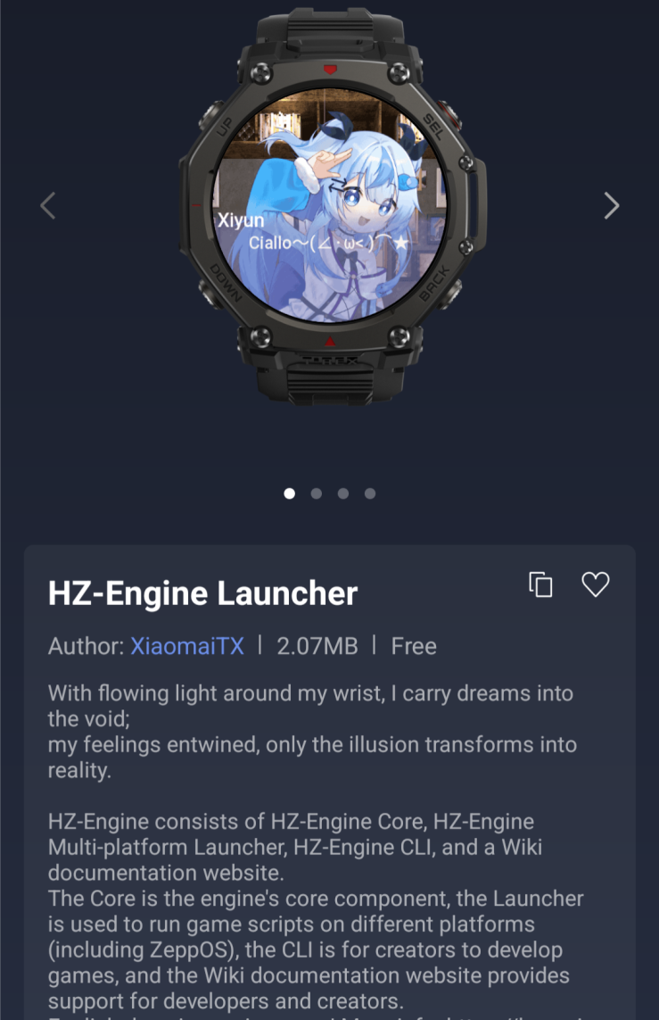 La nuova applicazione più popolare, secondo la classifica Zepp OS Weekly Top 50 Apps Downloaded, è HZ-Engine Launcher. Il launcher può essere utilizzato per eseguire script di gioco per il motore di visual novel su Zepp OS. Altre aggiunte recenti e popolari includono il client Telegram tgwatch e CaferoChat, descritta come una "app di chat minimalista per smartwatch".