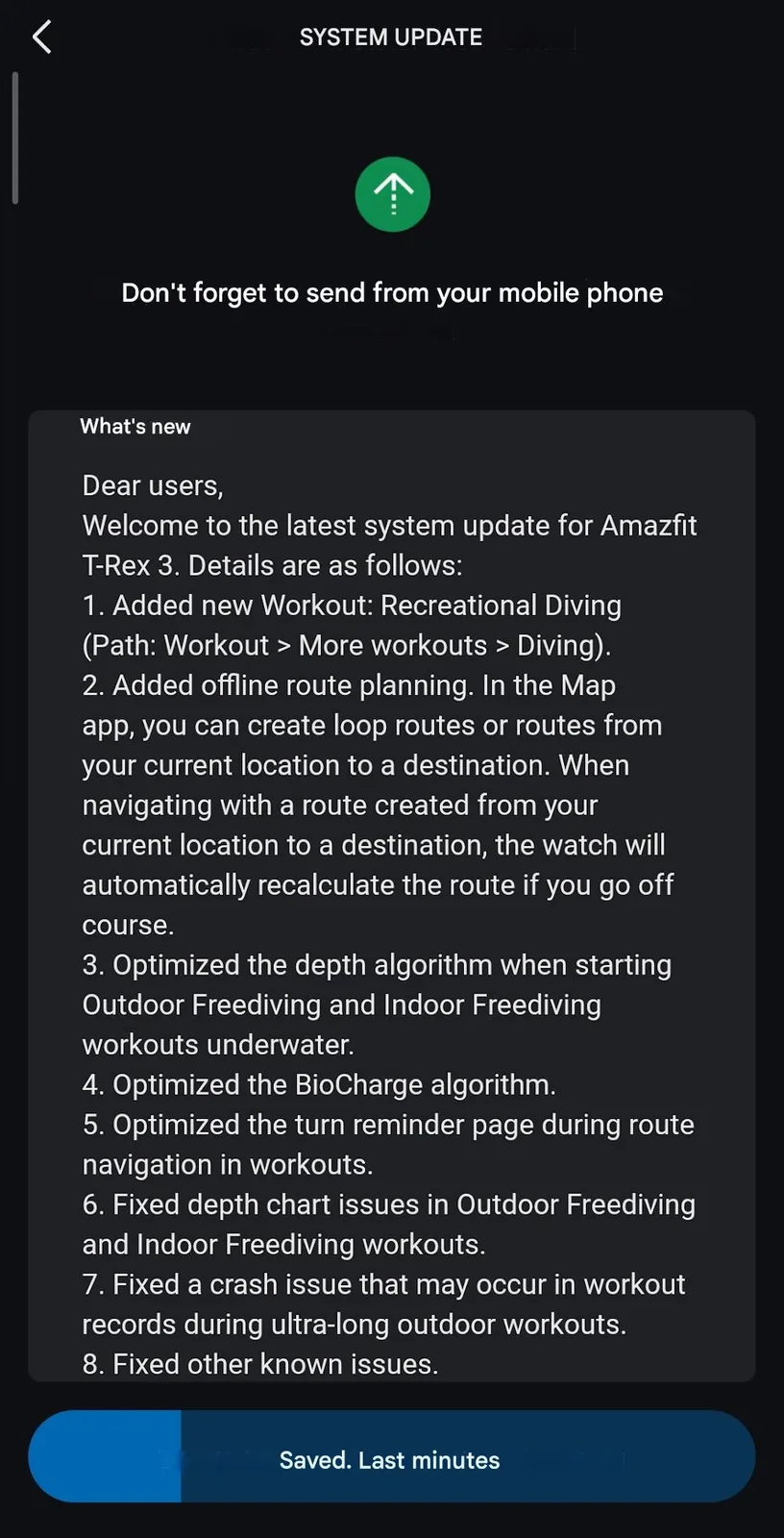 Zepp Health afferma che la versione 4.5.3.3 del software dello smartwatch Amazfit T-Rex 3 ottimizza l'algoritmo di profondità utilizzato per gli allenamenti Outdoor Freediving e Indoor Freediving. L'algoritmo alla base dello strumento di monitoraggio del livello energetico BioCharge è stato migliorato. Ci sono anche modifiche alla pagina di promemoria delle svolte, visualizzata quando si utilizza la navigazione del percorso durante un allenamento. Inoltre, sono stati corretti alcuni bug relativi ai grafici di profondità di Freediving e ai crash durante gli allenamenti ultra lunghi all'aperto.