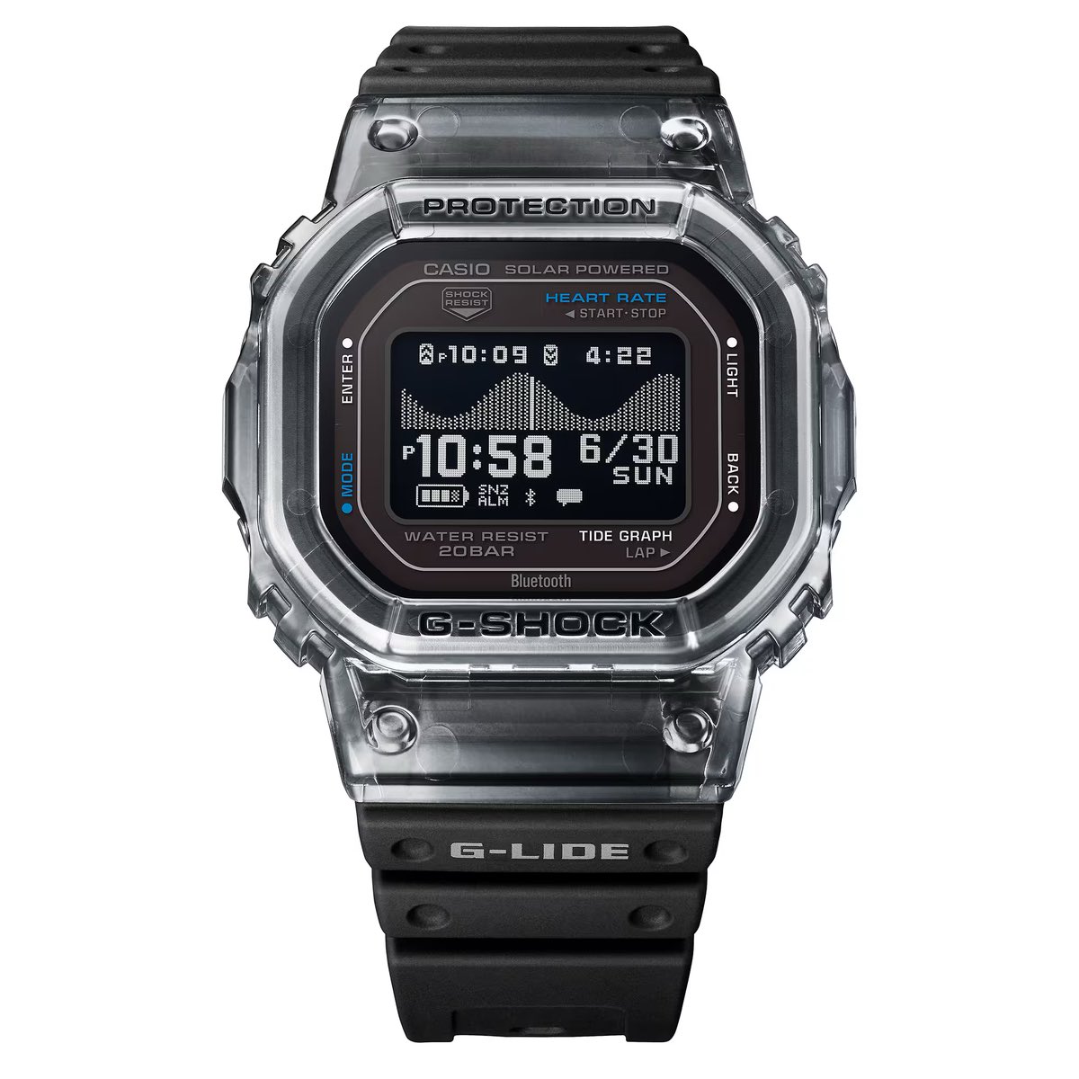 Fondono l'estetica da surfista con il tracciamento fitness G-Squad per il monitoraggio del fitness questi orologi dal volto squadrato prendono fortemente spunto dal popolare GBX-100. Sia il GBX-H5600-1 nero che il GBX-H5600-2 blu sono caratterizzati da un design traslucido e rinfrescante che trasmette perfettamente le vibrazioni estive della spiaggia e vantano un MIP LCD ad alta definizione e ad alto contrasto che rende il controllo delle notifiche e dei grafici delle maree un gioco da ragazzi, anche alla luce diretta del sole. Entrambi sono realizzati in plastica biomassa ecologica e pesano solo 47 grammi.