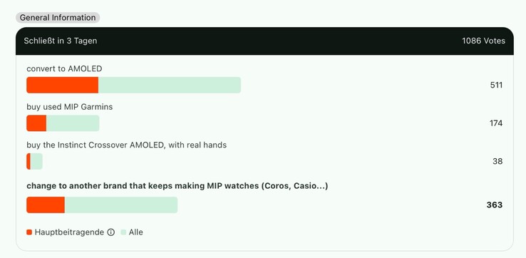 Un sondaggio su Reddit mostra che su 1.086 intervistati, un totale di 537 clienti acquisterebbe un modello più vecchio con display MiP o passerebbe a un altro marchio se Garmin abbandonasse il MiP. Solo 511 clienti prenderebbero in considerazione il passaggio a un modello con un pannello AMOLED. 38 intervistati opterebbero invece per l'Instinct Crossover, che combina un pannello AMOLED con le lancette dell'orologio