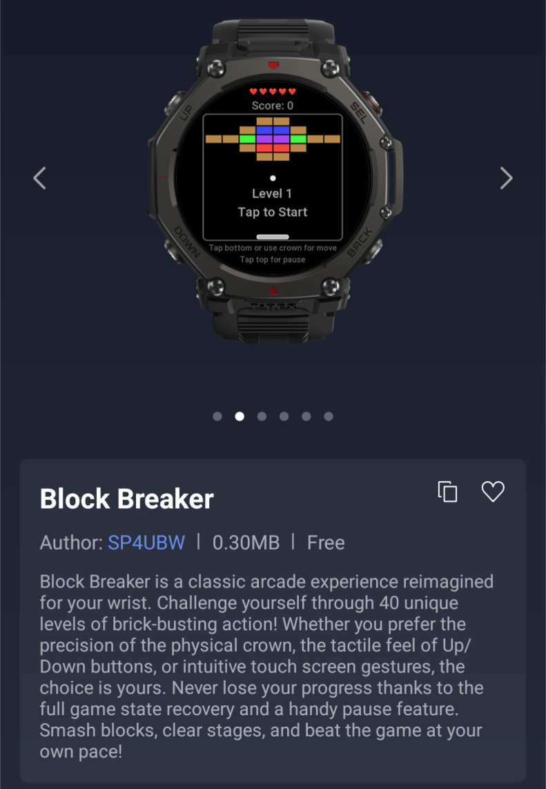 Oltre a questo, ci sono due nuovi giochi Mini App per gli utenti dello smartwatch Amazfit. Il primo è Block Breaker, una rivisitazione del classico gioco arcade con 40 livelli e la scelta di controlli a corona o a pulsante. Il secondo è Mr. Roundy, un gioco di avventura a piattaforme con 12 livelli, in cui gli utenti possono far saltare il personaggio toccando lo schermo. Le ultime due Mini App sono Rain Runner e Squash Scoring.