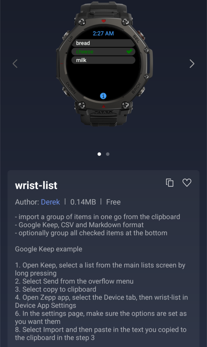 Le nuove versioni includono wrist-list, un'applicazione per le liste di controllo che supporta elenchi importati in formati come Google Keep, CSV e Markdown. Sound Generator è uno strumento di utilità in grado di generare toni sinusoidali puri. Può utilizzarlo per testare le apparecchiature audio o per eliminare l'acqua dagli altoparlanti dello smartwatch. Un'altra aggiunta è AlarmZone, che "assicura che lei si alzi davvero dal letto". L'app di sveglia interattiva richiede agli utenti di compiere un'azione, come scuotere l'orologio o risolvere un problema di matematica, per fermare la sveglia.