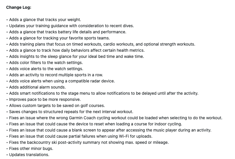 Garmin ha aggiunto una serie di nuovi piani di allenamento per gli allenamenti a tempo, gli allenamenti cardio e gli allenamenti di forza. Ci sono impostazioni aggiuntive per i filtri colore e gli avvisi vocali, oltre a più suoni di allarme. Inoltre, le notifiche intelligenti possono ora essere messe in pausa fino al termine dell'attività, una funzione che si controlla tramite il menu delle fasi. L'aggiornamento affronta anche i bug legati al ciclismo indoor, al lettore musicale e ai caricamenti Wi-Fi. Può trovare il registro completo delle modifiche nello screenshot qui sotto.