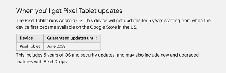 Il tablet Google Pixel è stato lanciato a giugno 2023 con Android 13. Inizialmente, Google aveva promesso solo tre aggiornamenti principali di Android e aggiornamenti di funzionalità fino a giugno 2026, anche se il tablet Pixel avrebbe dovuto ricevere patch di sicurezza per cinque anni. Ora, Google ha confermato sul suo sito web di supporto https://support.google.com/googlepixeltablet/answer/13399216?hl=en che il tablet Pixel riceverà gli aggiornamenti del sistema operativo per cinque anni.