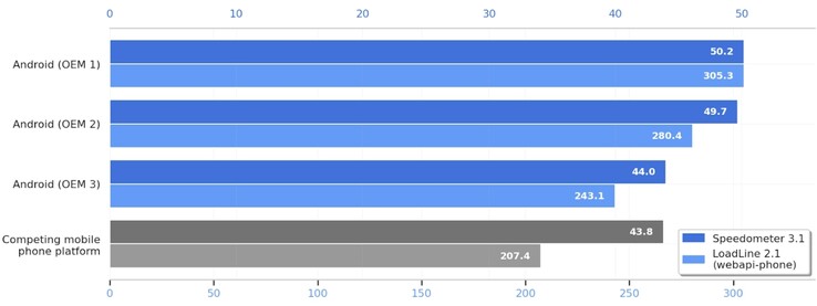 Speedometer è un progetto congiunto di Apple, Google e Mozilla e simula le attività comuni dell'utente, come cliccare sui pulsanti per navigare e scorrere, per misurare la "velocità" di un browser. I risultati dei benchmark condivisi da Google mostrano che i telefoni di punta Android senza nome superano i telefoni più recenti di una "piattaforma di telefonia mobile concorrente" (leggi: iOS).