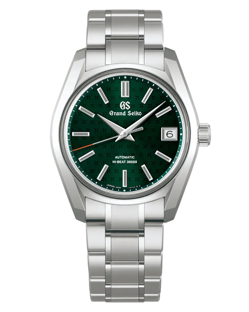 L'SBGH375 presenta un quadrante verde a raggiera con un motivo a fiori d'ulivo ripetuto, visibile da vicino negli scatti macro. Il colore sembra un verde bosco intenso sotto la maggior parte delle luci, che dovrebbe cambiare leggermente a seconda dell'angolazione. La lancetta dei secondi ha una punta arancione a contrasto, un piccolo accento che spicca sulla tonalità più scura del quadrante senza sovrastare troppo il design. Un datario incorniciato si trova a ore tre. Ulteriori dettagli saranno disponibili quando saranno disponibili le immagini pratiche dell'orologio.