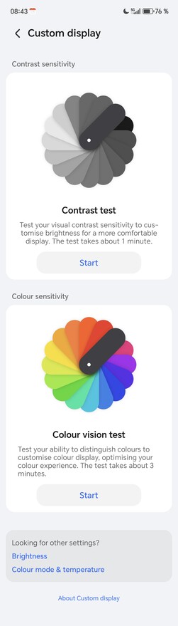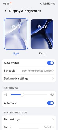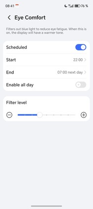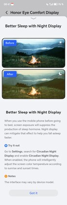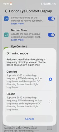 Il punto di contatto centrale di Honor Magic8 Pro è la voce di menu "Honor Eye Comfort Display", dove è possibile controllare direttamente tutte le funzioni aggiuntive. Oltre all'oscuramento PWM ad alta frequenza, che può funzionare sia a 3.840 Hz che a 4.320 Hz a bassa luminosità del display, ci sono anche funzioni comuni come "Tono naturale", che regola i colori dello schermo in base alla luce ambientale. Ciò si traduce in una visualizzazione più calda, in quanto la proporzione di luce blu viene ridotta. La "Visualizzazione notturna circadiana" funziona in modo simile, progettata per ridurre la soppressione degli ormoni del sonno la sera. C'è anche una modalità scura configurabile, in modo che il display mostri i contenuti in una tonalità più scura la sera, cosa che offre anche la maggior parte degli altri smartphone Android.