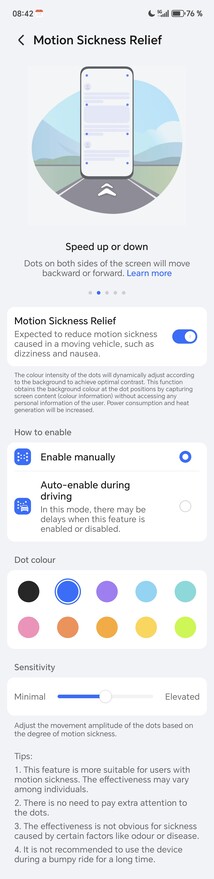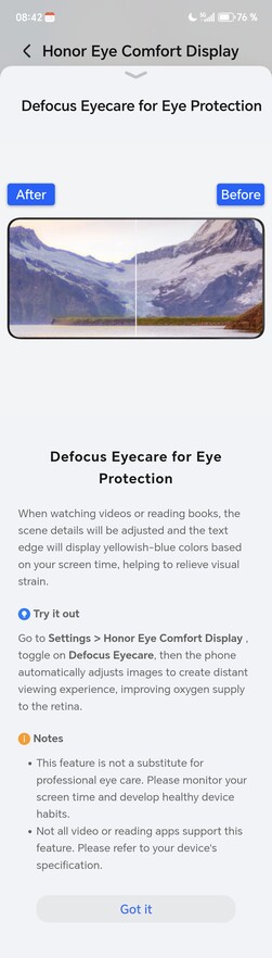Un'altra funzione specifica di Honor è "Defocus Eyecare" che simula lo sguardo in lontananza per alleviare l'affaticamento degli occhi e supporta oltre 2.000 applicazioni. Magic8 Pro può anche alleviare la cinetosi causata dal viaggio in auto. Ai bordi dello schermo vengono visualizzate delle sfere colorate che si muovono con l'accelerazione del veicolo. Lo scopo è quello di ridurre le potenziali vertigini o la nausea. In pratica, ha funzionato sorprendentemente bene.