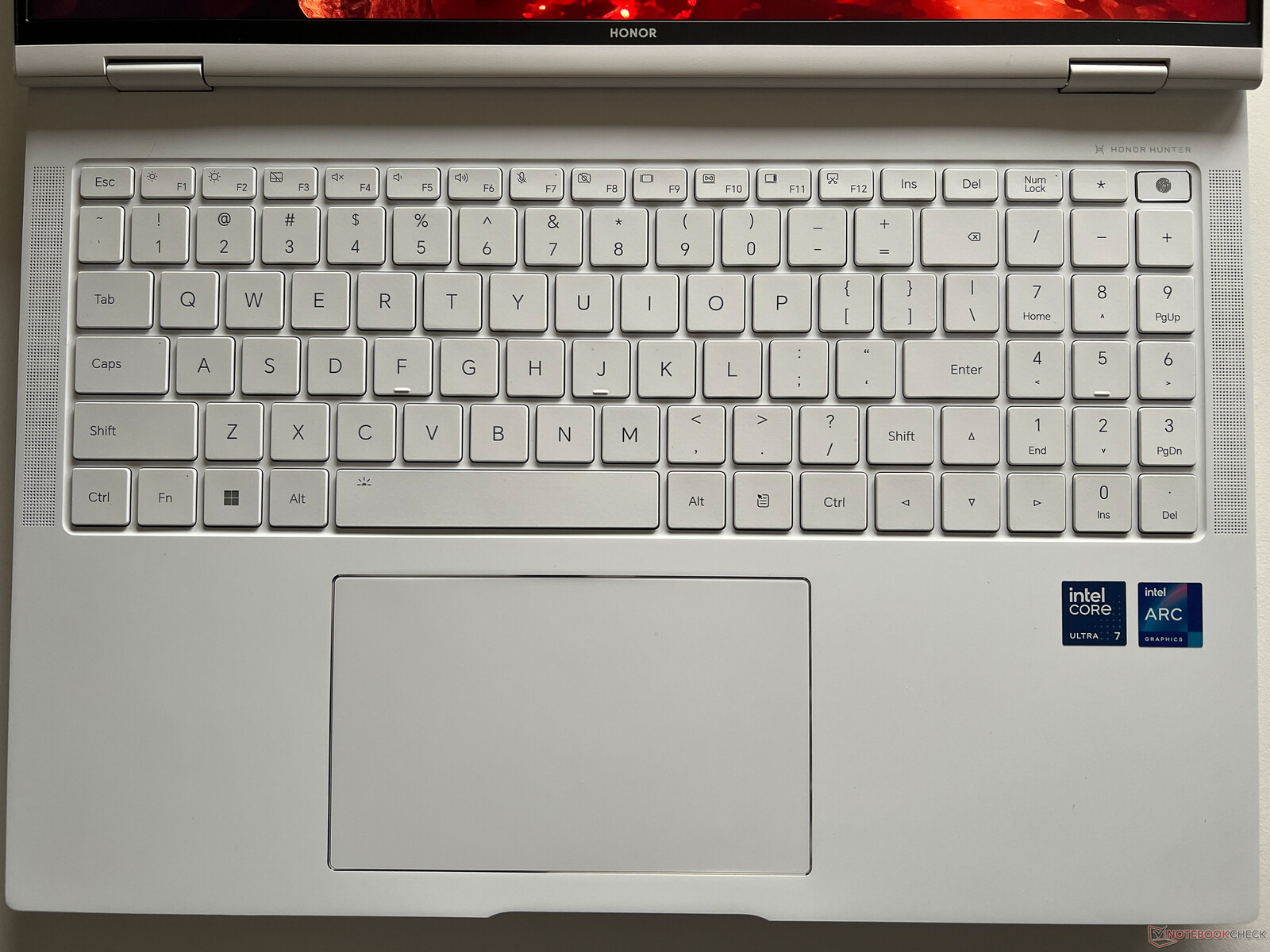 MagicBook Pro 16 offre un'ampia tastiera con tastierino numerico e retroilluminazione bianca. Questa può essere attivata automaticamente, ma il contrasto tra i tasti bianchi e l'illuminazione è molto basso, il che significa che la loro visibilità in condizioni di scarsa illuminazione può essere ancora peggiore. Ma questo è un problema generale che si riscontra nelle tastiere di colore chiaro. A parte questo, l'esperienza di digitazione è molto confortevole e rende anche i testi più lunghi un gioco da ragazzi. Il pulsante di accensione si trova in alto a destra e, oltre ad essere integrato nella tastiera, ospita lo scanner di impronte digitali.