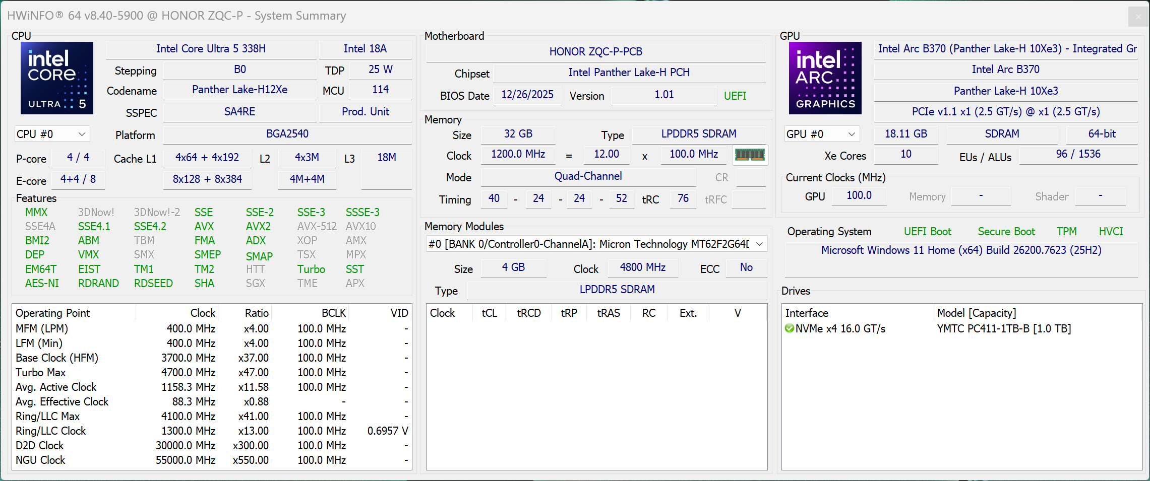| Honor MagicBook Pro 14 2026 Intel Core Ultra 5 338H ⎘ Intel Arc B370 10 Xe3 Panther Lake iGPU ⎘ 32 GB Memoria, 1024 GB SSD | Amazon: | 1.4 kg | 15.9 mm | 14.60" 3120x2080 257 PPI OLED | |