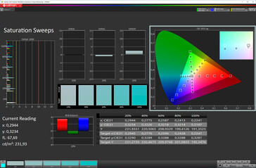 La riproduzione del colore è molto precisa nel più piccolo spazio colore sRGB (profilo: Normale), e anche le scale di grigio mostrano solo deviazioni che sono effettivamente percepibili all'occhio umano qua e là. Se si sceglie lo spazio di colore DCI-P3 più grande, si ottiene un'immagine molto più fredda.