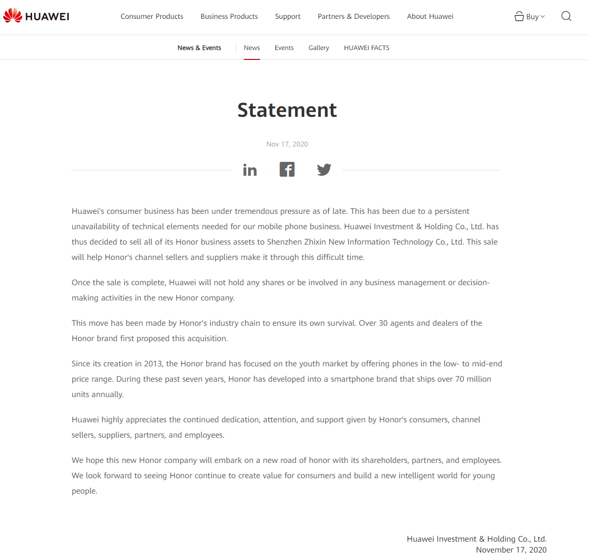 La vendita di Honor è andata a buon fine, dopo settimane di voci secondo cui Huawei aveva intenzione di scaricare la sua controllata. Questa volta Huawei ha rilasciato una dichiarazione ufficiale in merito, confermando che Shenzhen Zhixin New Information Technology Co. Ltd, è in realtà un consorzio dell'ex società di vendita Honor Digital China e della città di Shenzhen, come era stato ipotizzato in precedenza.