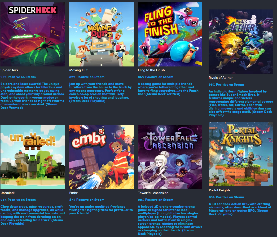- Towerfall Ascension - un party game locale fino a 4 giocatori che ha vinto diversi premi. Ha un prezzo di 14,99 dollari, è classificato come Steam Deck Playable ed è stato rilasciato nel 2014.