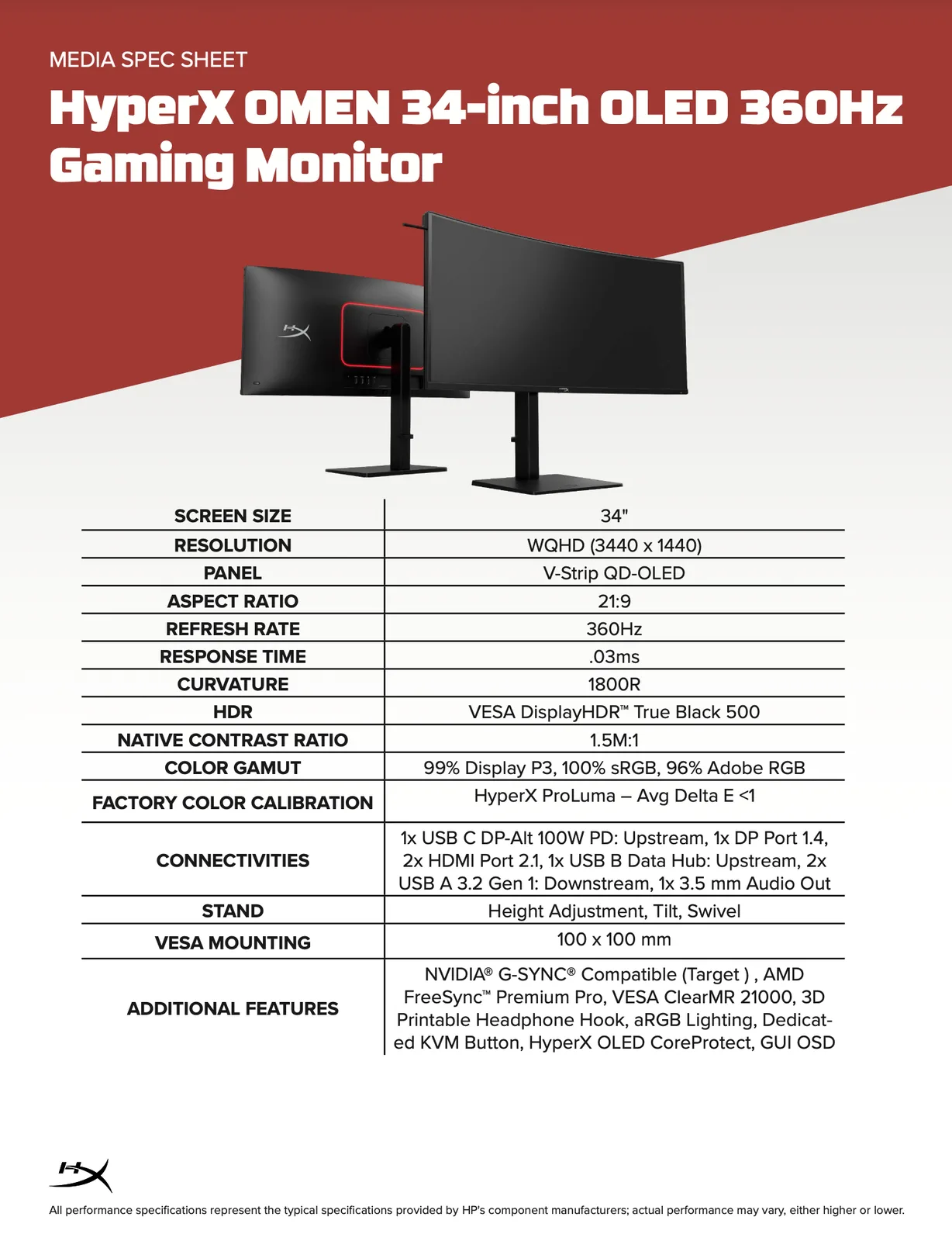 Tuttavia, HyperX Omen da 34 pollici supera gli equivalenti più vecchi con una frequenza di aggiornamento di 360 Hz. Come evidenzia il foglio delle specifiche qui sotto, il nuovo monitor combina la risoluzione 1440p e la frequenza di aggiornamento di 360 Hz con tempi di risposta GtG di 0,03 ms, oltre alle tecnologie AMD FreeSync Premium Pro e Nvidia G-Sync per mitigare il tearing delle immagini. Secondo HP, il pannello ha anche la certificazione VESA DisplayHDR True Black 500. Di conseguenza, l'HyperX Omen 34 pollici dovrebbe raggiungere 500 nits e almeno il 95% di copertura dello spazio colore DCI-P3, con HP che cita il 99% e il 96% dello spazio colore AdobeRGB.