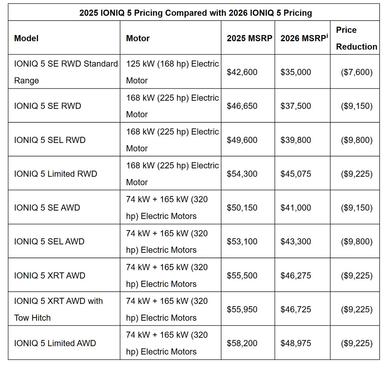 La 2026 Ioniq 5 SUV con porta Tesla NACS che non necessita di un adattatore Lectron per ricaricare presso i Supercharger, ad esempio, ottiene una massiccia riduzione di prezzo fino a 9.800 dollari, per un prezzo di partenza di soli 35.000 dollari per il modello base RWD.
