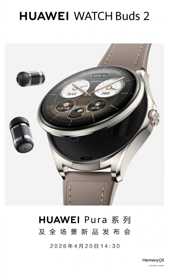 Il nuovo dispositivo indossabile sarà lanciato con il nome di Huawei Watch Buds 2 e sarà annunciato il 20 aprile insieme ad una serie di altri prodotti, tra cui il modello Huawei Pura X Max. Huawei ha anche condiviso un poster che svela l'aspetto del nuovo Watch Buds 2.