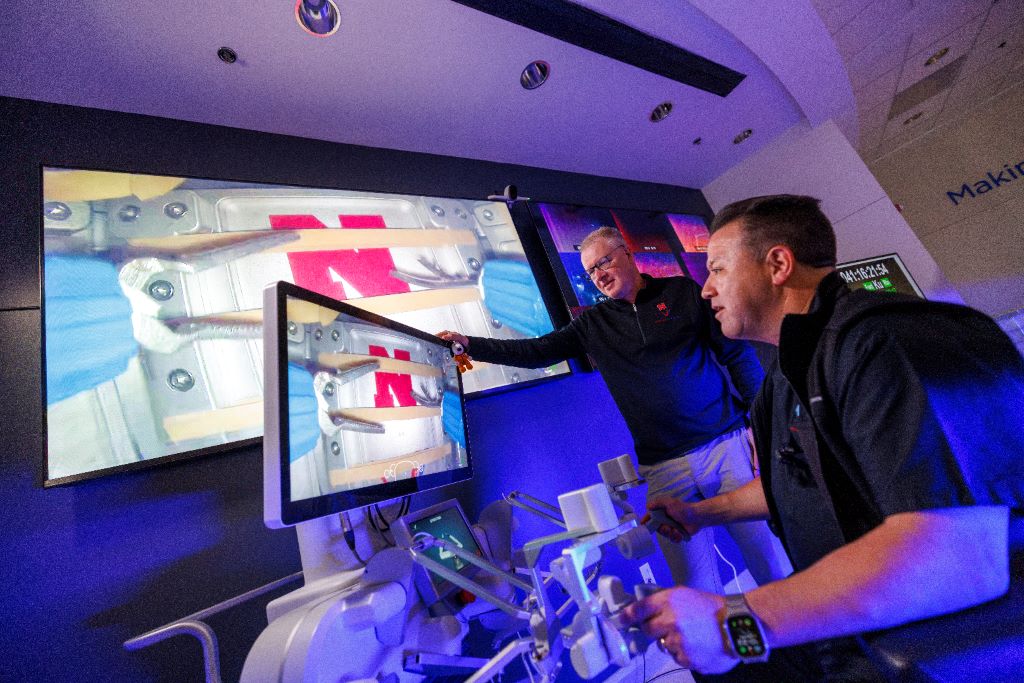 Craig Chandler | Comunicazione e Marketing dell'UniversitàNebraska Il professore di Ingegneria e co-fondatore di Virtual Incision Shane Farritor fa un turno utilizzando il robot chirurgico mentre il Dr. Dmitry Oleynikov osserva.