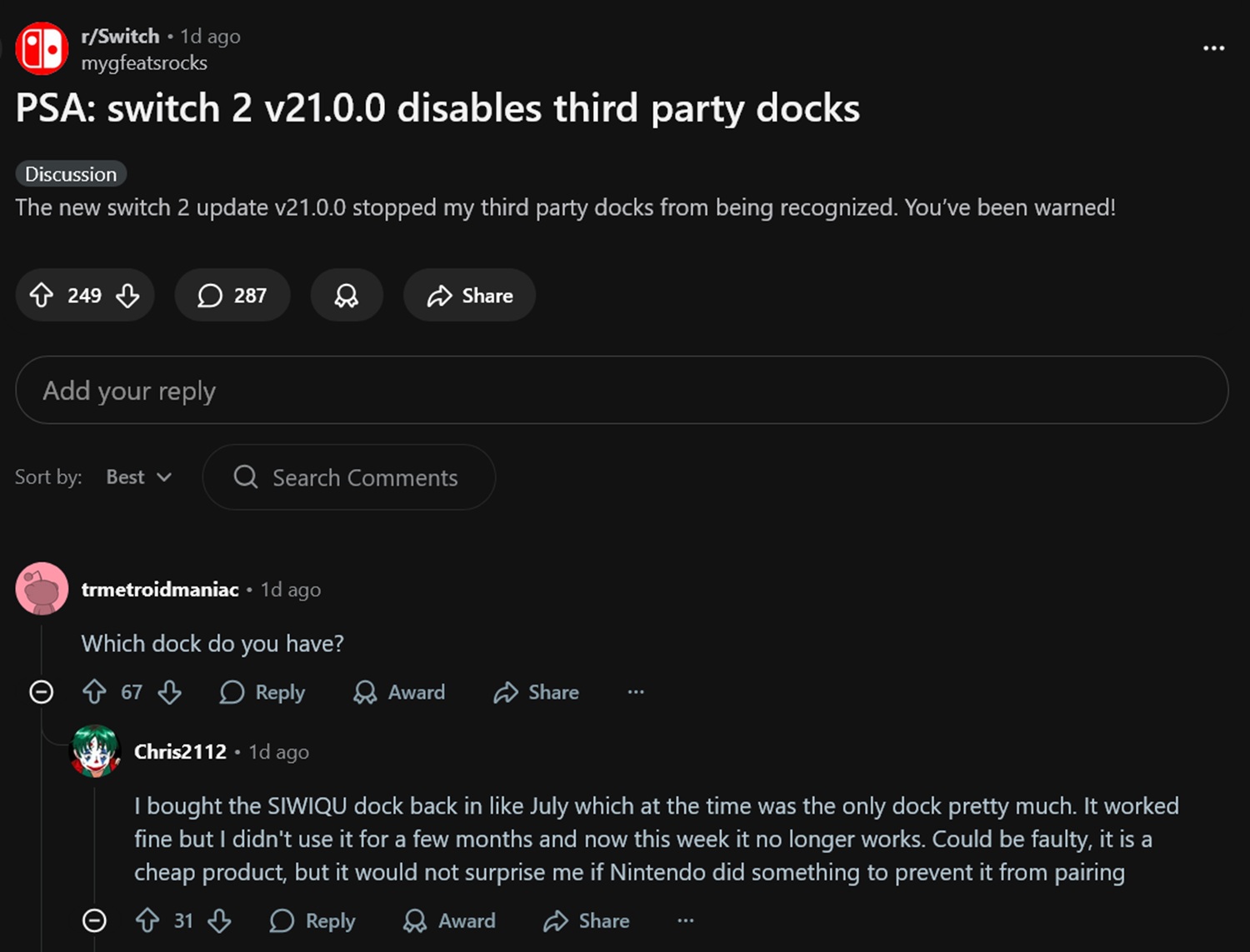 In un esempio pubblicato su Reddit, un popolare dock per Switch 2 di Siwiqu è stato colpito. Chris2112 spiega di aver acquistato il dock a luglio e di non aver avuto problemi. Purtroppo, diversi mesi dopo, non è più così. Il giocatore sospetta che la colpa sia dell'ultimo aggiornamento del firmware di Nintendo, un'affermazione sostenuta da molti altri lettori.