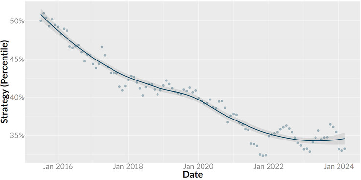 Secondo l'indagine, che ha confrontato l'interesse per 12 motivazioni di gioco - i motivi per cui i giocatori giocano - ha rilevato che, mentre la maggior parte delle motivazioni di gioco sono rimaste costanti o hanno subito solo lievi cambiamenti, la strategia ha visto un sostanziale calo di interesse. In particolare, la strategia è scesa dal 50° percentile al 33° percentile. O, come hanno detto i ricercatori, "il 67% dei giocatori di oggi si preoccupa meno del pensiero strategico e della pianificazione quando gioca rispetto al giocatore medio di giugno 2015"