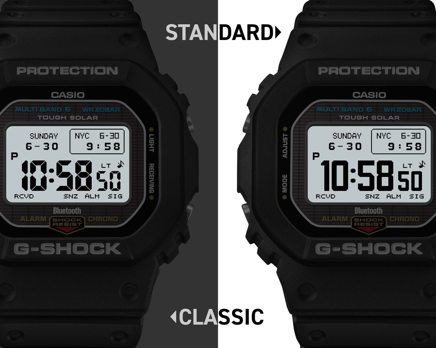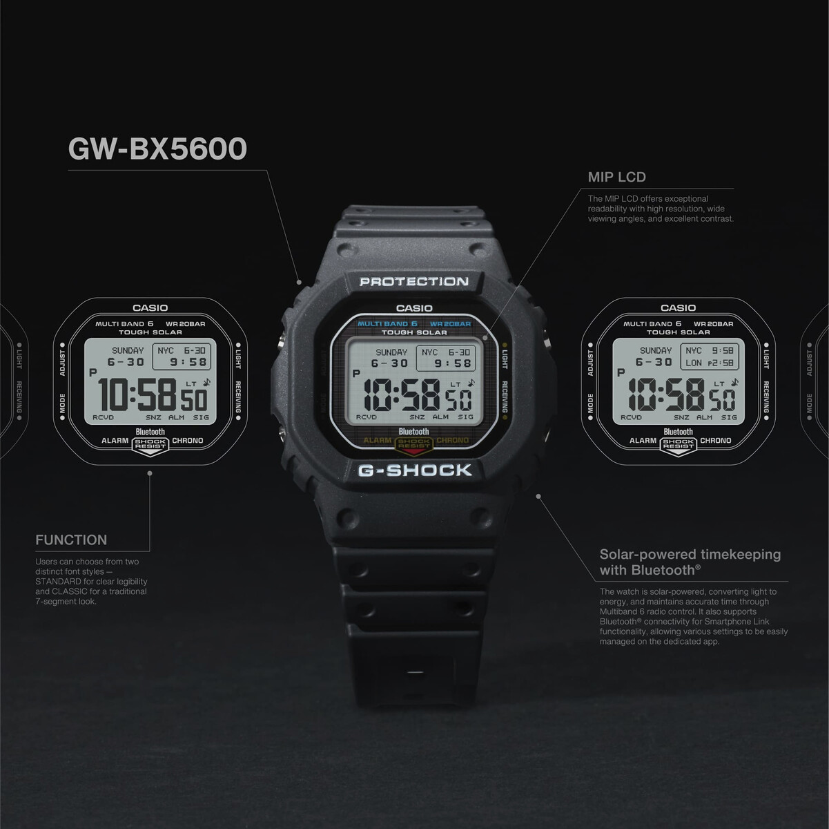 Entrambi i modelli sono dotati dell'ultimo MIP LCD ad alta definizione di Casio, con una maggiore chiarezza rispetto al display DW-5600 standard. Il modello GW-BX5600-1JF utilizza il caratteristico motivo a mattoncini di G-Shock con un anello di accento chiaro, mentre il modello GW-BX5600-1A1JF presenta un look più discreto, completamente oscurato.