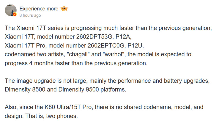 Invece, affermano che Xiaomi 17T Pro e Redmi K90 Ultra sono due smartphone distinti. Scrivendo su Weibo, Experience more prevede che sia lo Xiaomi 17T Pro che lo Xiaomi 17T siano "quattro mesi avanti rispetto alla generazione precedente". Pertanto, potremmo vedere la serie Xiaomi 17T fare il suo debutto globale a metà o fine maggio 2026 piuttosto che a settembre 2026.