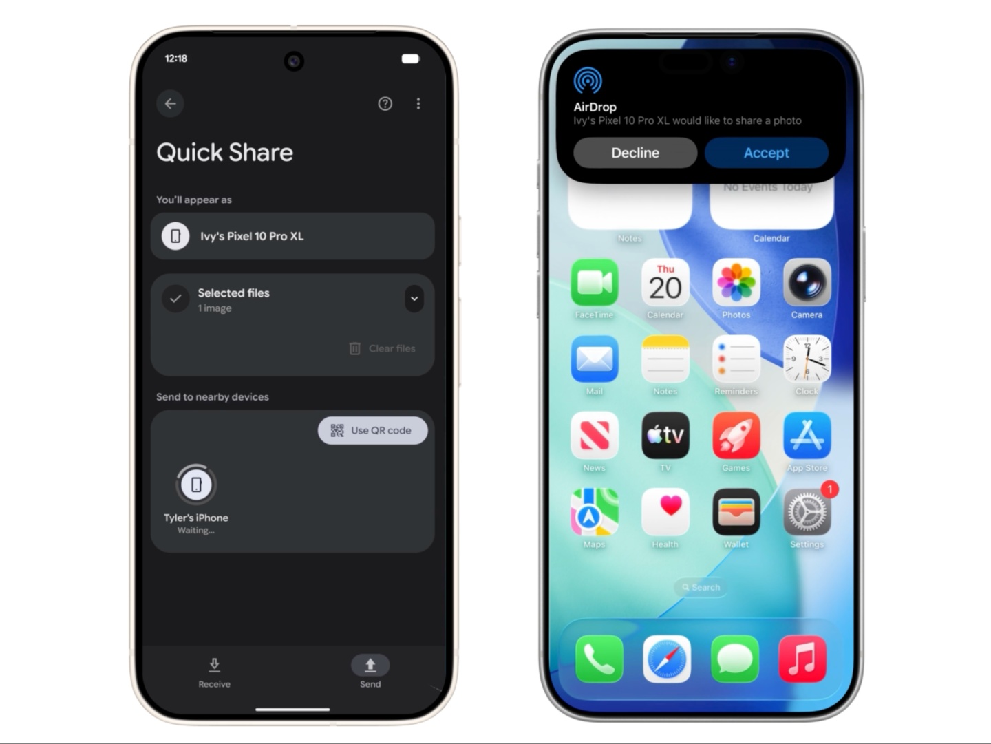 Come mostrato nell'animazione, il menu Quick Share sarà in grado di trovare gli iPhone che hanno attivato AirDrop quando si trovano nelle vicinanze con la visibilità impostata su 'Tutti per 10 minuti', per poi inviare facilmente i file. Allo stesso modo, i proprietari di iPhone, o di qualsiasi dispositivo Apple con AirDrop, possono utilizzare il menu AirDrop per condividere file con i dispositivi Pixel 10 nelle vicinanze. Google afferma che la funzione sta iniziando oggi (20 novembre) per la serie Pixel 10 e l'azienda sta lavorando per estenderla ad altri dispositivi Android.