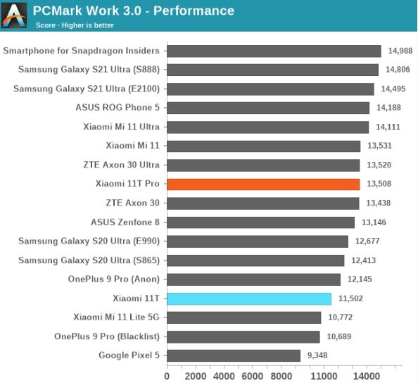 Secondo i test eseguiti dai bravi ragazzi di AnandTech, la Dimensity 1200 è in ritardo rispetto allo Snapdragon 888 nella maggior parte dei benchmark delle prestazioni della CPU. I risultati mostrano che lo Snapdragon 888 sullo Xiaomi 11T Pro supera di gran lunga la Dimensity 1200 dell'11T di circa il 25% nei test di benchmark come JetStream, Speedometer e PCMark. Questo non dovrebbe essere un problema, in quanto ha senso che il modello "Pro" più costoso offra prestazioni migliori.