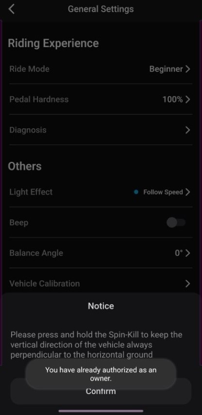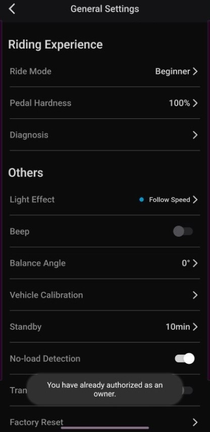 L'E20 richiede la connessione all'app INMOTION (per iOS o Android) per inizializzarsi correttamente. Inoltre, consente all'utente di registrarsi come proprietario del veicolo, di connettersi al dispositivo e di controllare alcune delle sue funzioni.