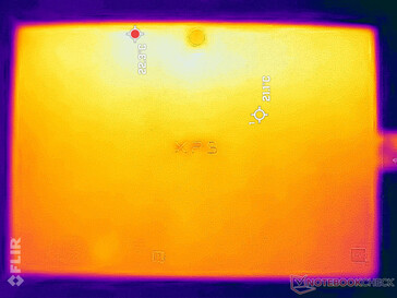 Le temperature superficiali sono generalmente più calde lungo la metà superiore dell'unità, mentre la metà inferiore è sensibilmente più fredda. I punti caldi sulla parte anteriore e posteriore possono raggiungere rispettivamente 42 C e 39 C, rispetto ai soli 30 C dei punti più freddi. L'unità non diventa mai scomoda da tenere in mano, indipendentemente dall'orientamento o dal posizionamento. Le temperature complessive sono molto più fresche di quelle registrate sul Surface Pro 8, dove l'intera parte anteriore e posteriore dell'unità può raggiungere i 43°C e i 48°C.
