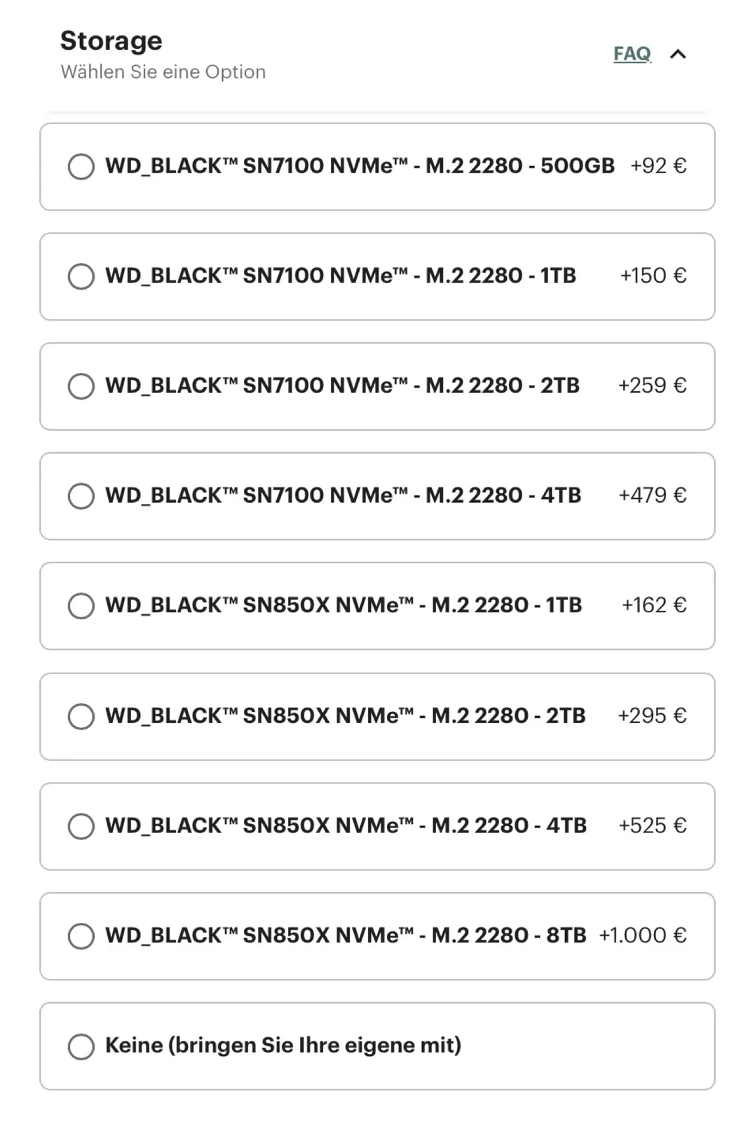 Un confronto dei prezzi rende evidente che i prezzi sono aumentati drasticamente nelle ultime settimane. Un WD Black SN7100 con 1 TB di spazio di archiviazione era ancora disponibile a 69 euro in ottobre, ma attualmente costa almeno 99 euro. PC Part Picker mostra una tendenza simile nella sua analisi del mercato SSD statunitense.