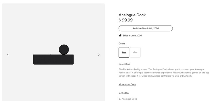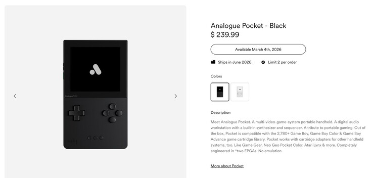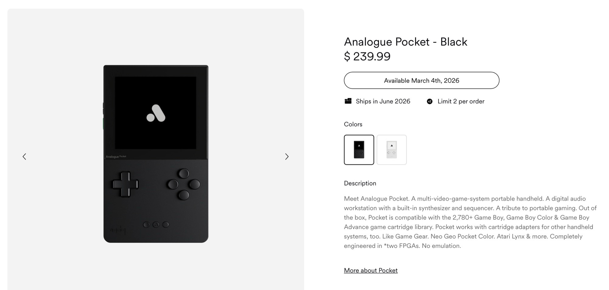 Dopo essere stato esaurito nelle scorse settimane, il palmare da gioco sarà nuovamente ordinabile dal negozio online del produttore https://store.analogue.co/products/analogue-pocket-black a partire da mercoledì 4 marzo, ma al prezzo di 239 dollari. Anche la docking station di accompagnamento sarà ordinabile nello stesso periodo al prezzo di 99,99 dollari. La consegna di entrambi i prodotti è prevista a partire da giugno 2026. Come ha dichiarato Analogue su Xquesto ultimo aumento di prezzo è dovuto alle tariffe statunitensi, attualmente fissate al 10% sulle importazioni da tutto il mondo